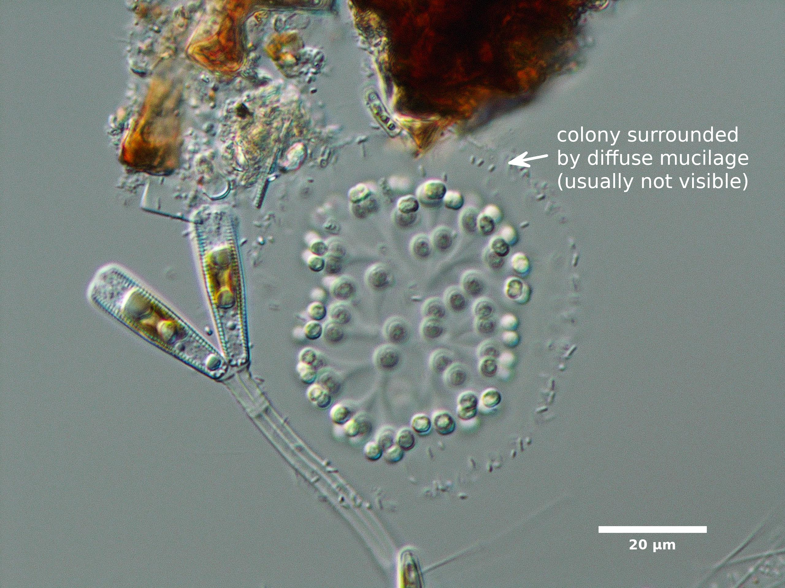 D2. CELLS NOT ATTACHED TO RADIATING MUCILAGE STRANDS (STRANDS MAY BE PRESENT BUT INVISIBLE UNDER NORMAL MAGNIFICATION)