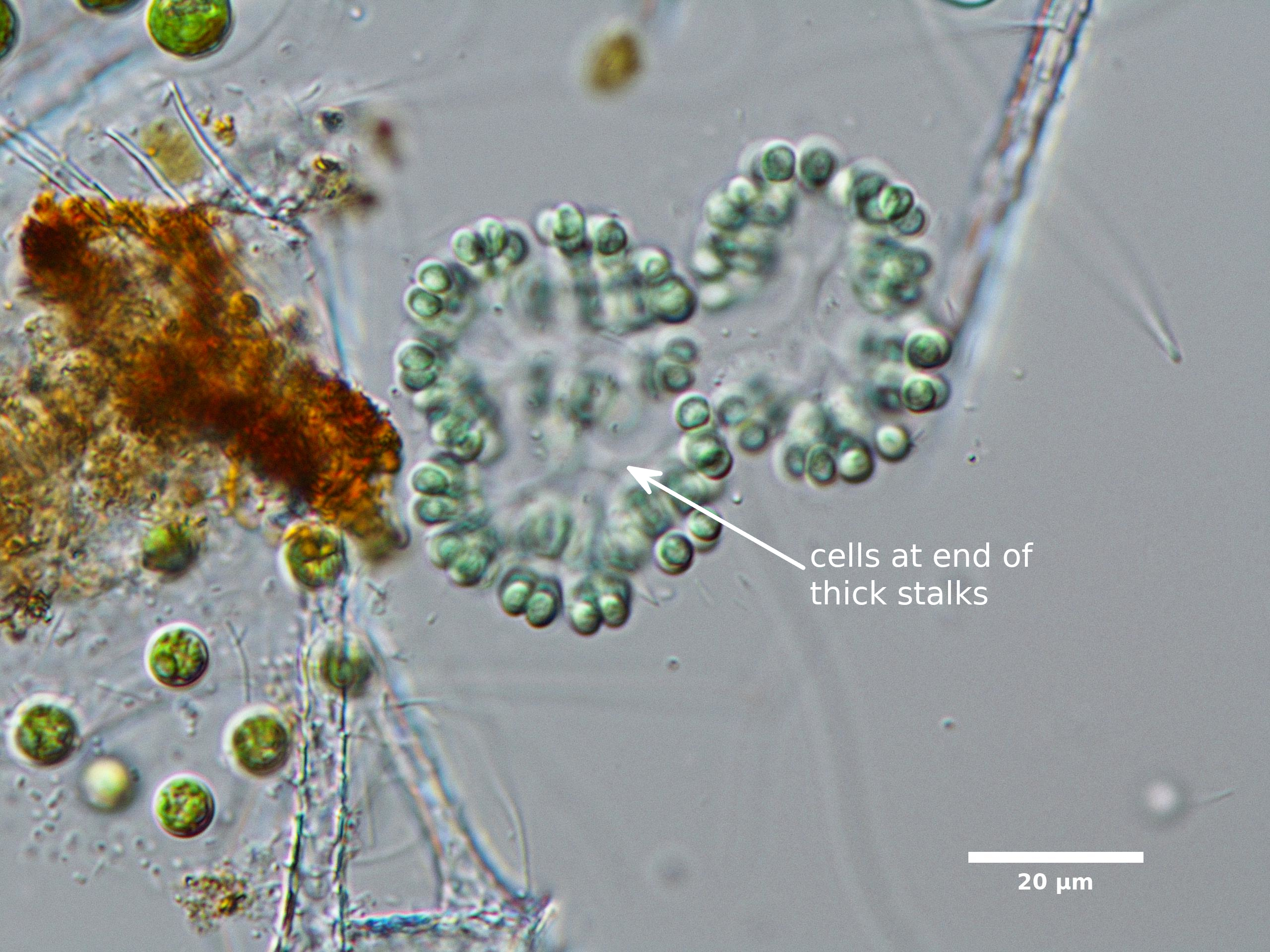 E1. CELLS SPHERICAL, IN GROUPS OF 2 OR 4 AT END OF THIN, RADIATING MUCILAGE STRANDS: