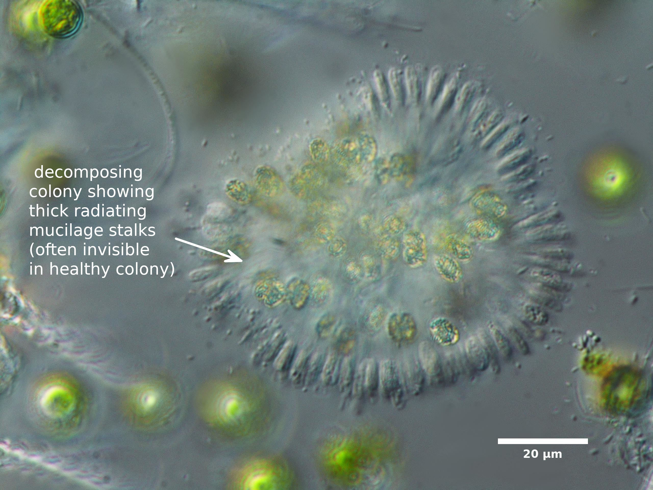 E3. CELLS FORM AT END OF THICK, RADIATING MUCILAGE STRANDS THAT ARE RARELY VISIBLE; INDIVIDUAL CELLS SPHERICAL OR OVAL, NOT HEART-SHAPED; MOST COMMON SPECIES IS DARK MOTTLED BROWN: