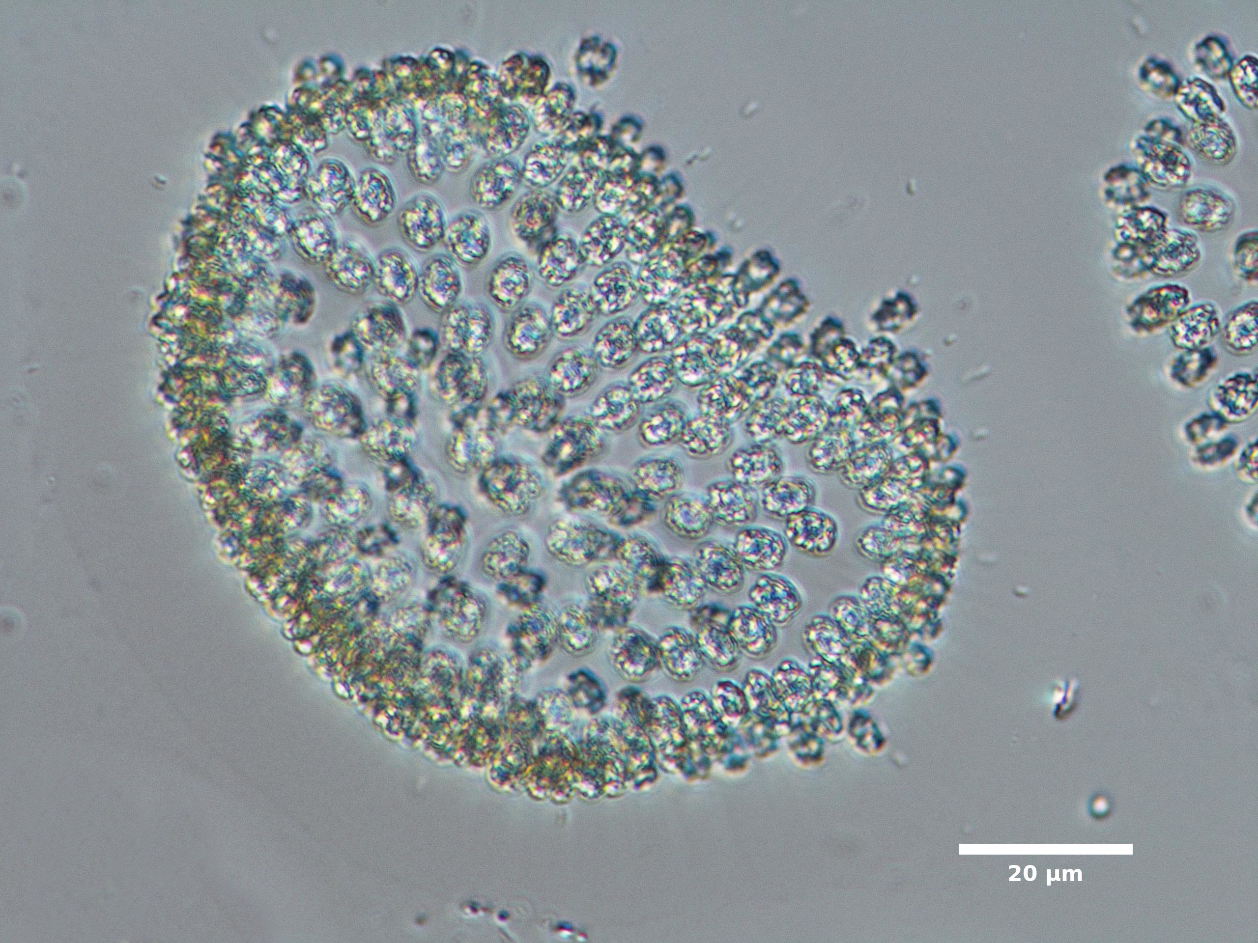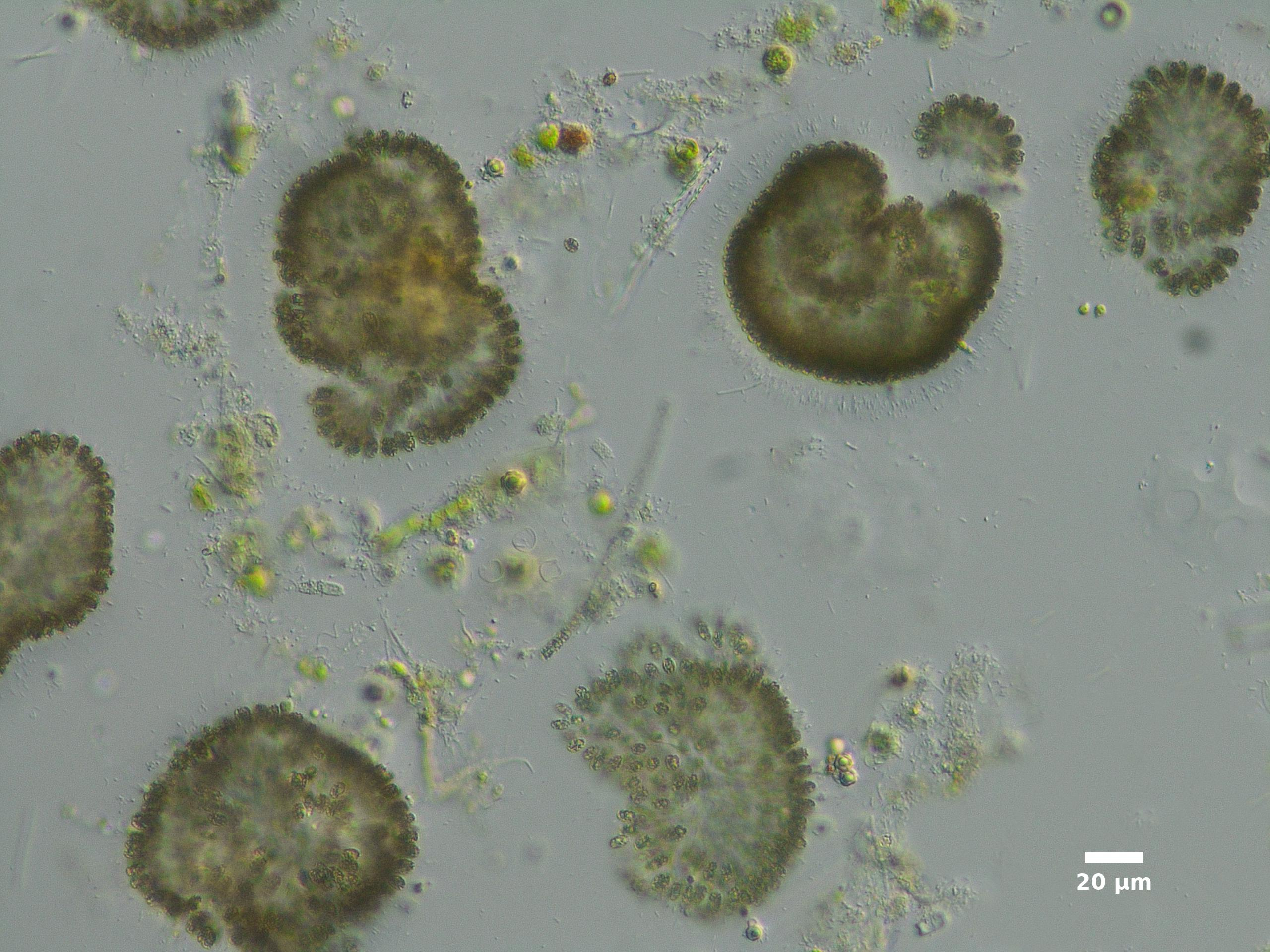 F2. CELLS FORM AT END OF THICK, RADIATING MUCILAGE STRANDS BUT THESE STRANDS ARE OFTEN NOT VISIBLE; INDIVIDUAL CELLS SPHERICAL OR OVAL; MOST COMMON SPECIES IS DARK MOTTLED BROWN: