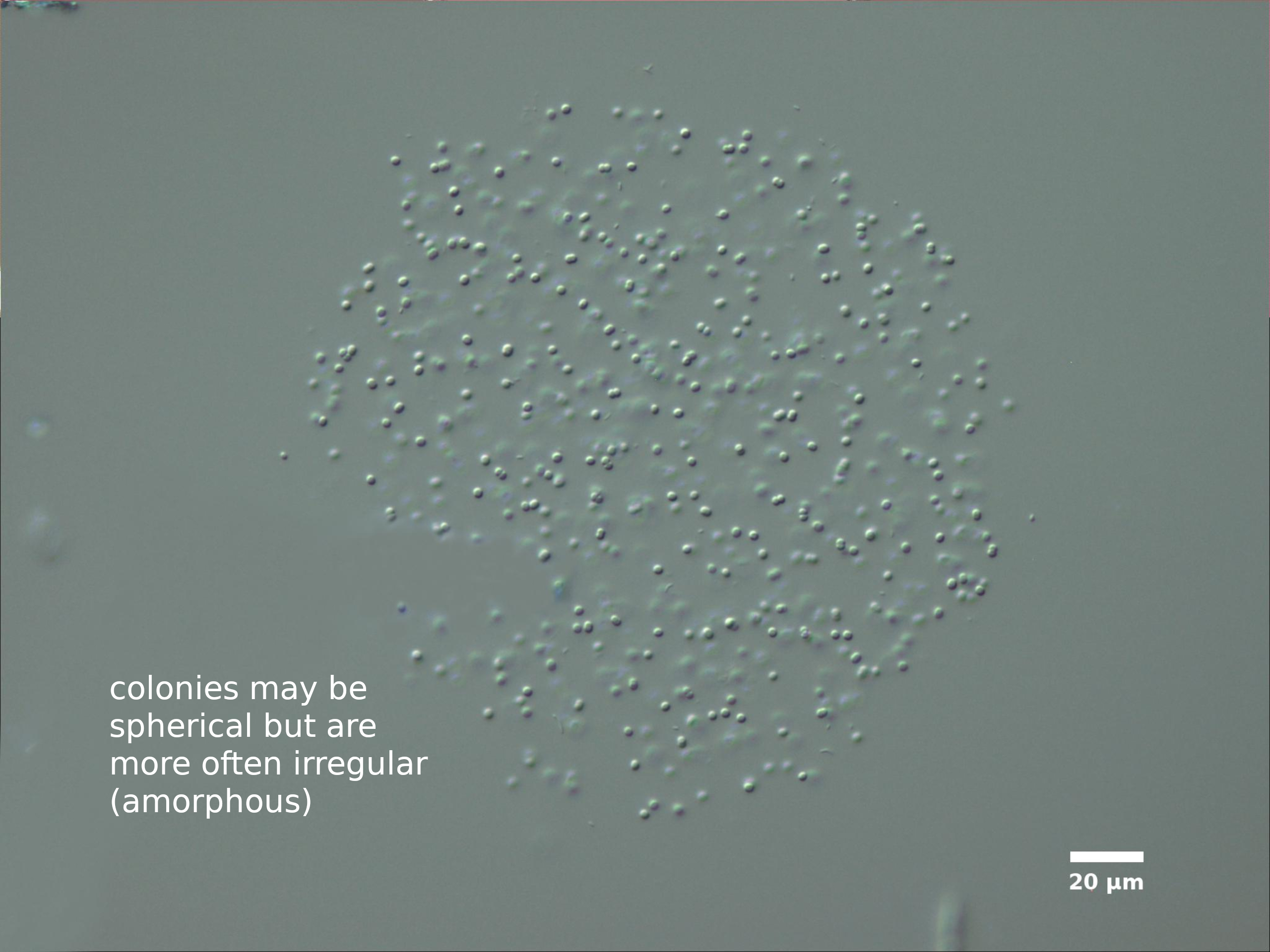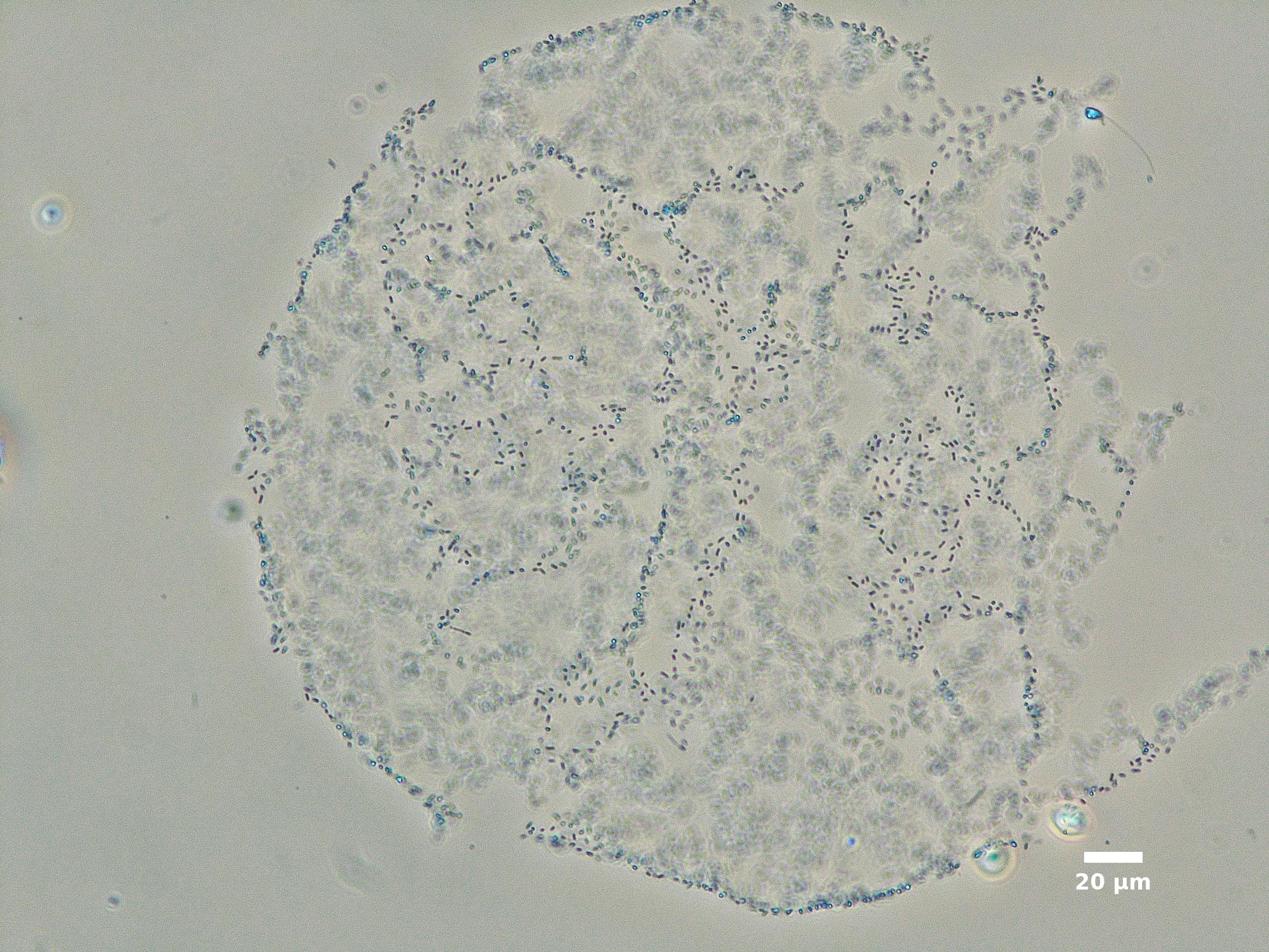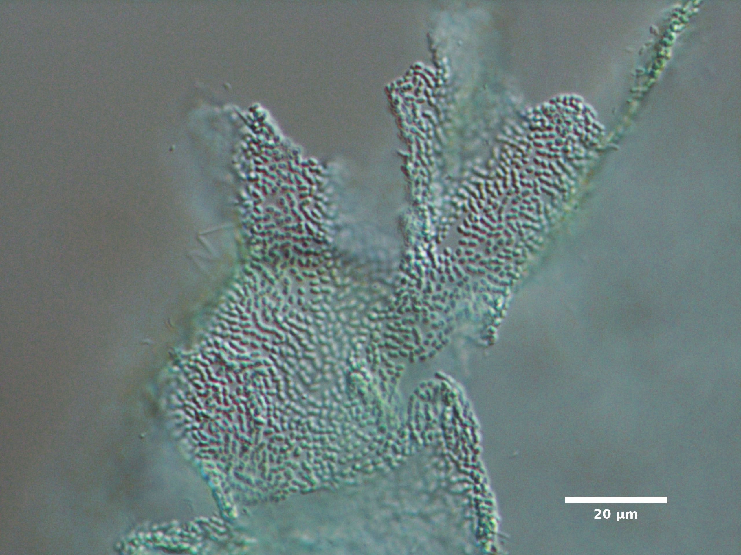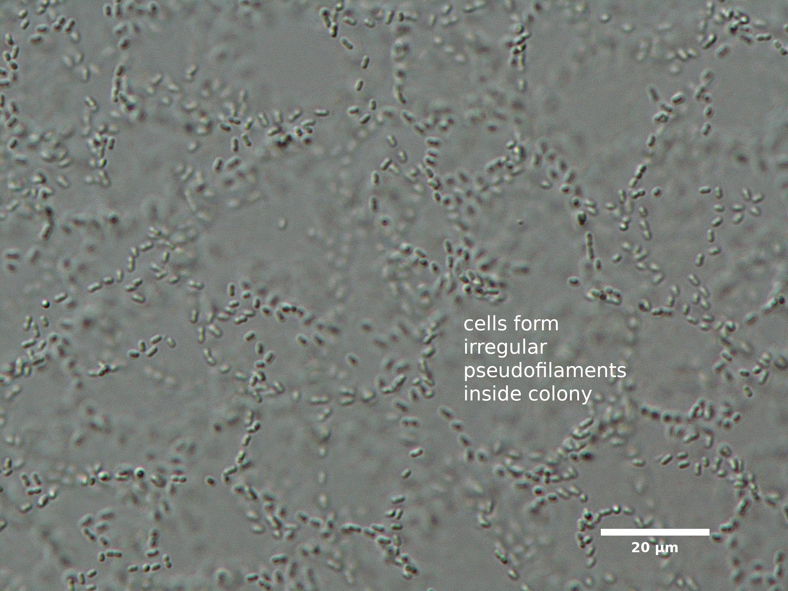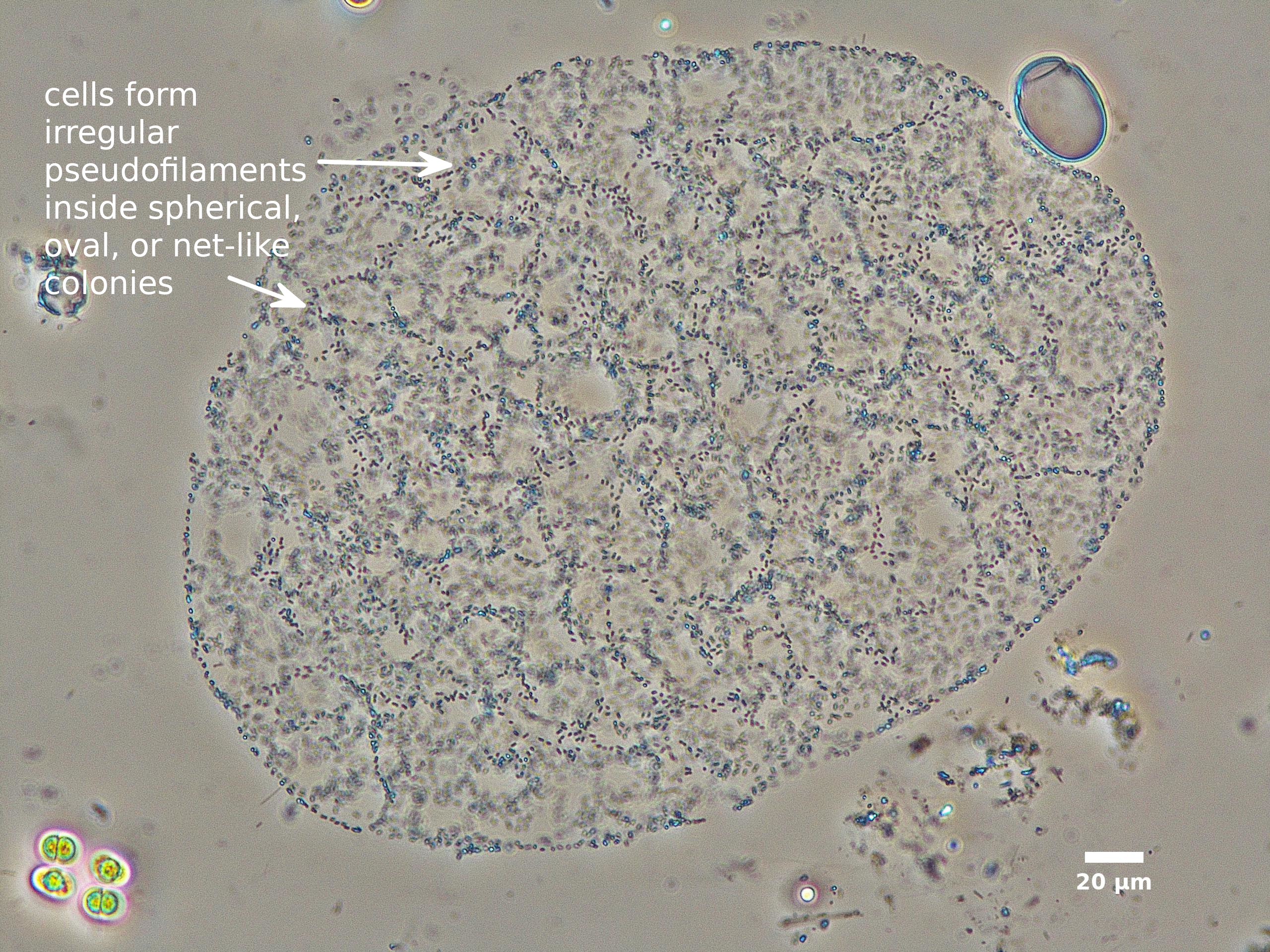 F1. CELLS TINY (width <2 µm), ROD-SHAPED, PALE BLUE-GRAY; FORMING SHORT PSEUDOFILAMENTS INSIDE COLONY; COLONIES SPHERICAL, IRREGULAR, OR NET-LIKE (CLATHRATE):