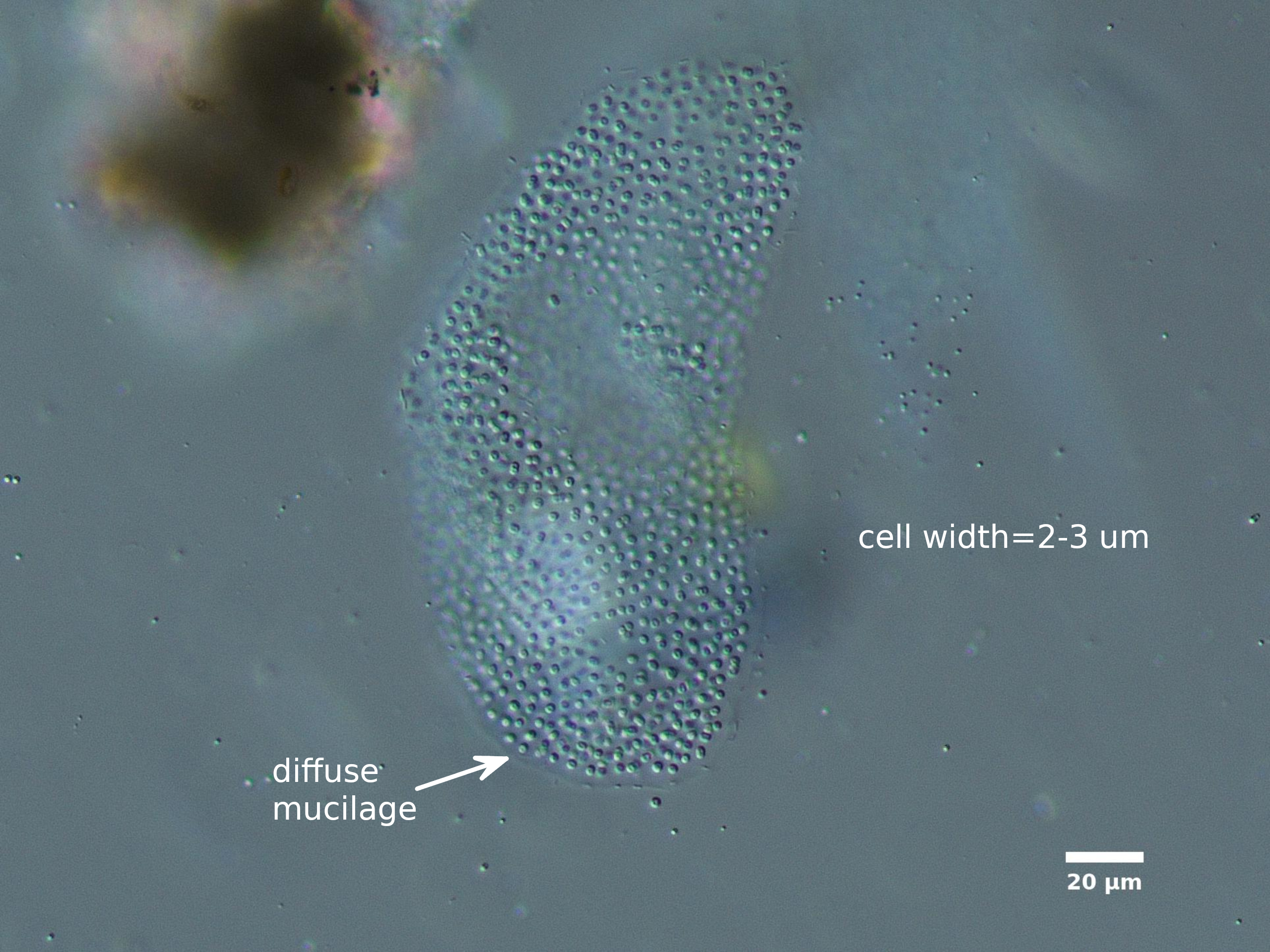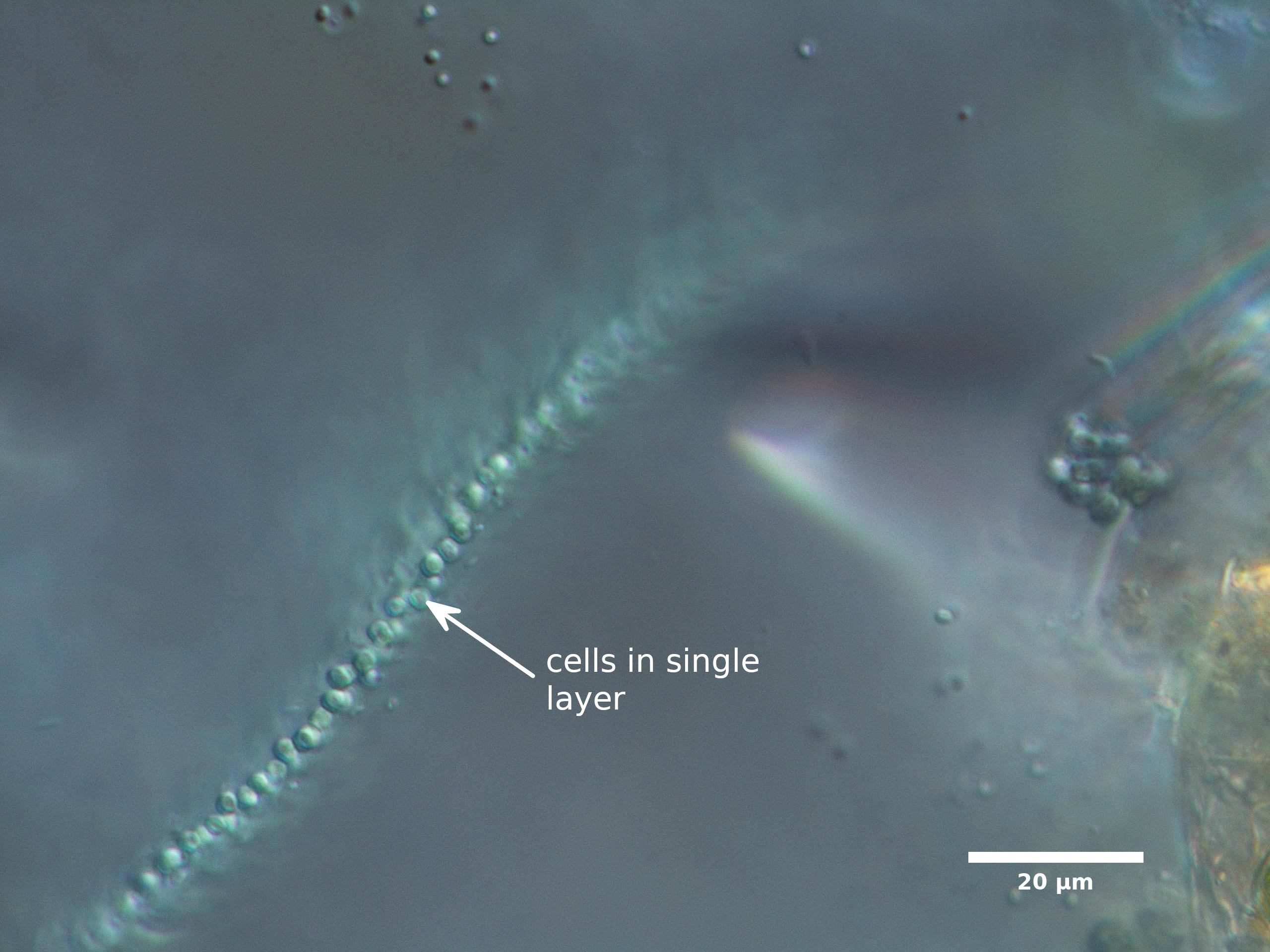 D2. CELLS NOT ATTACHED TO RADIATING MUCILAGE STRANDS (STRANDS MAY BE PRESENT BUT INVISIBLE UNDER NORMAL MAGNIFICATION)