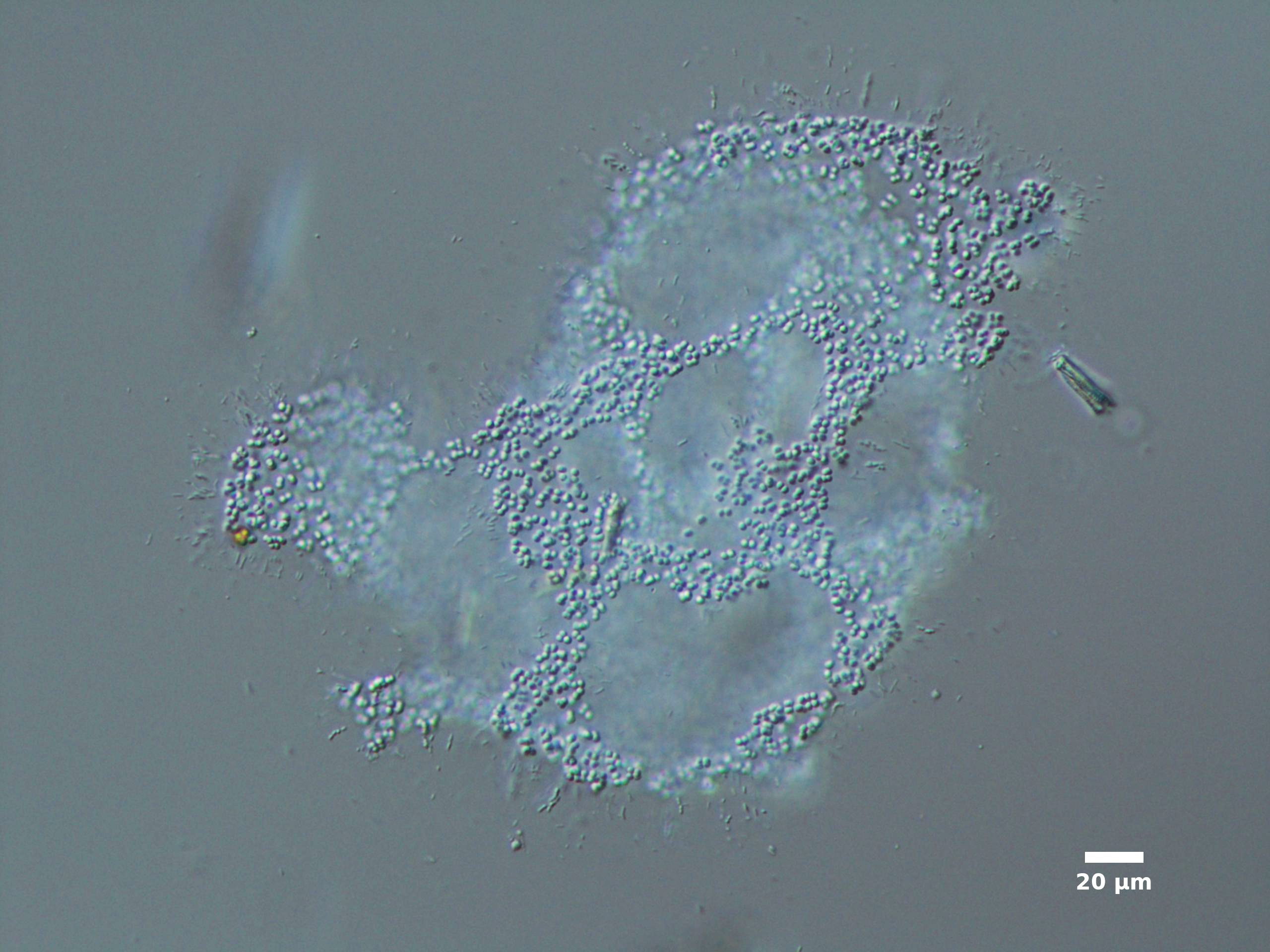 F2. CELLS TINY (<4 µm), SPHERICAL OR OVAL; BLUE-GRAY, IN SINGLE FLAT LAYER FORMING SPHERICAL, IRREGULAR, OR NET-LIKE (CLATHRATE) COLONIES: