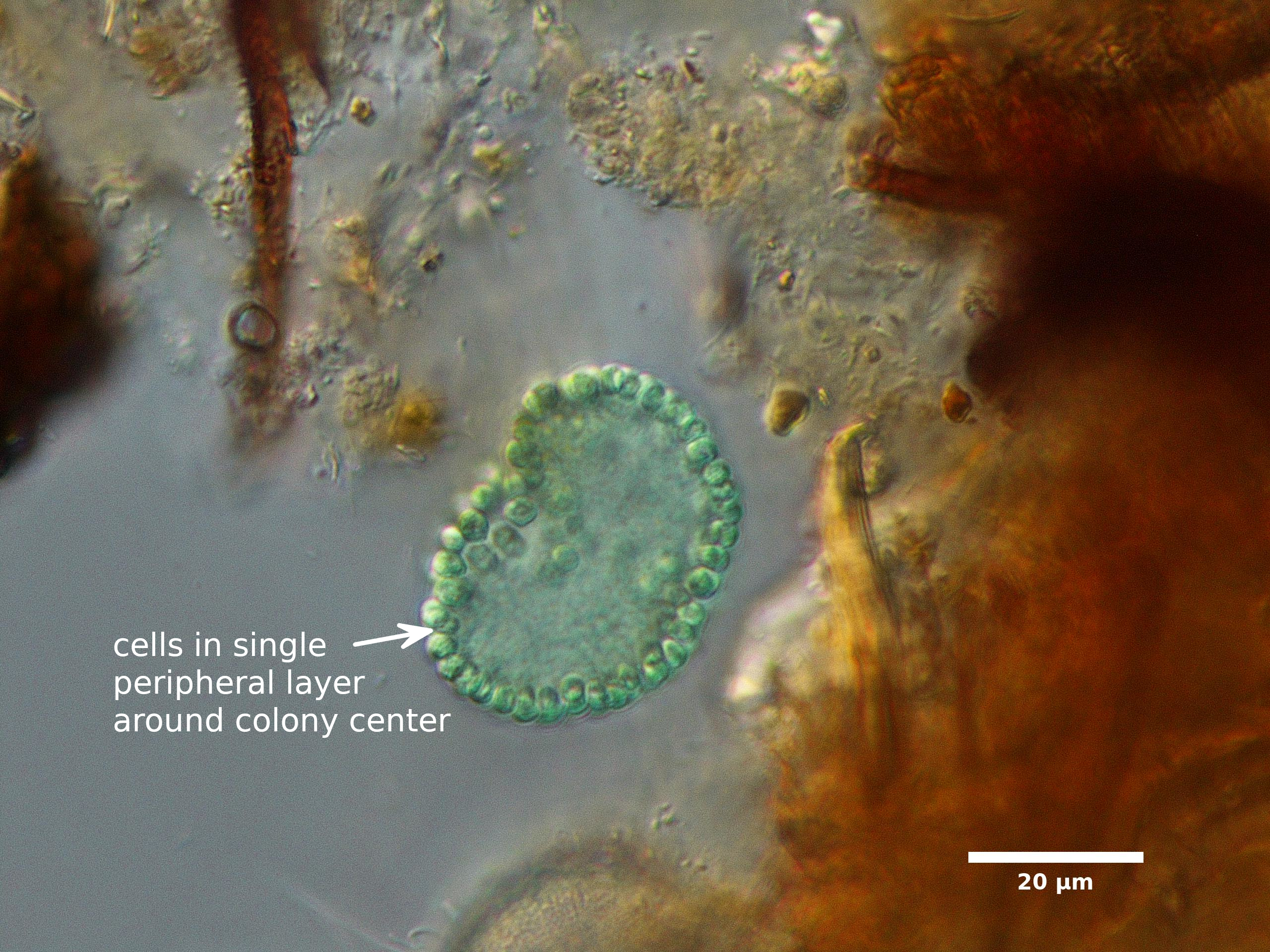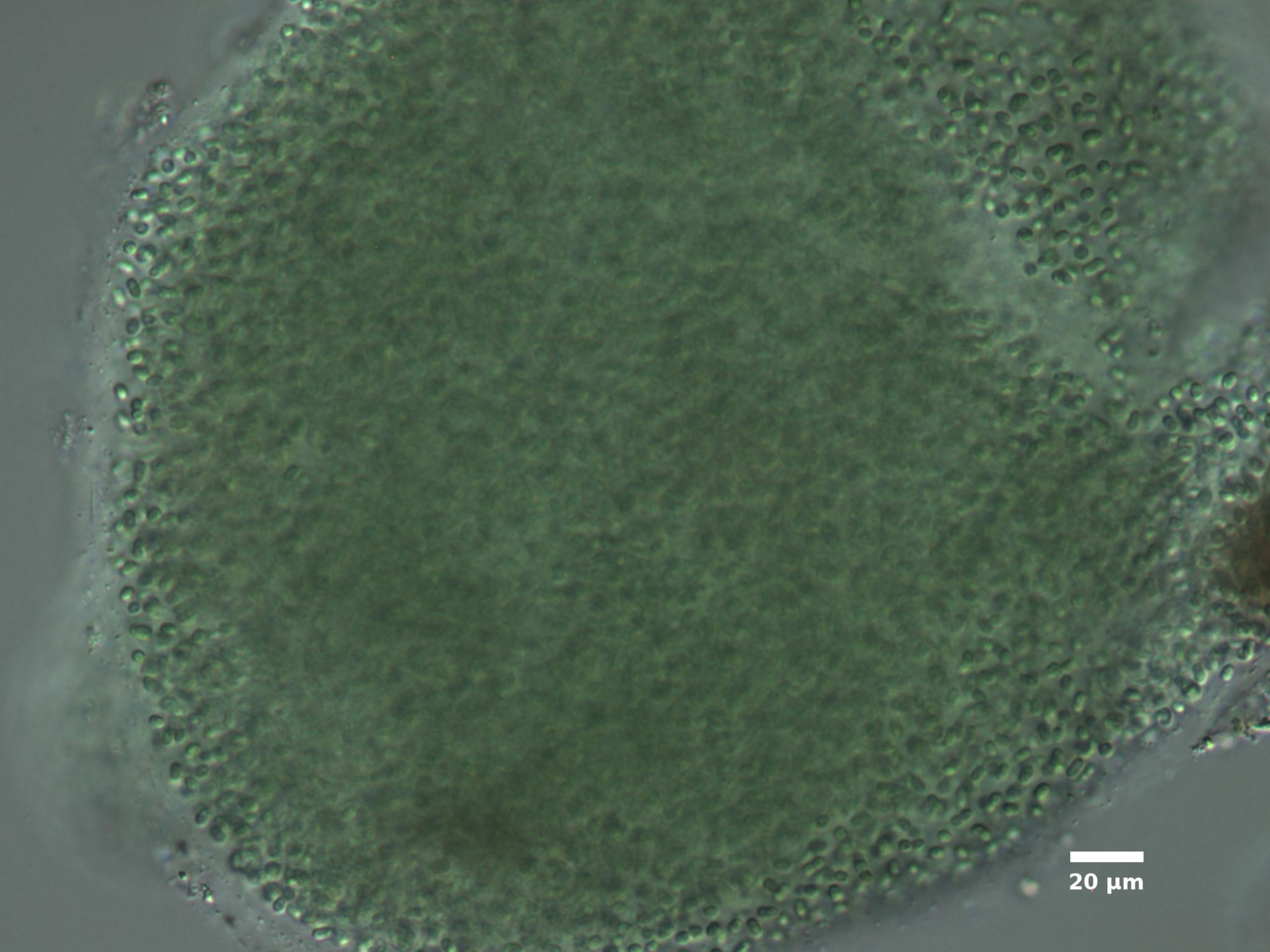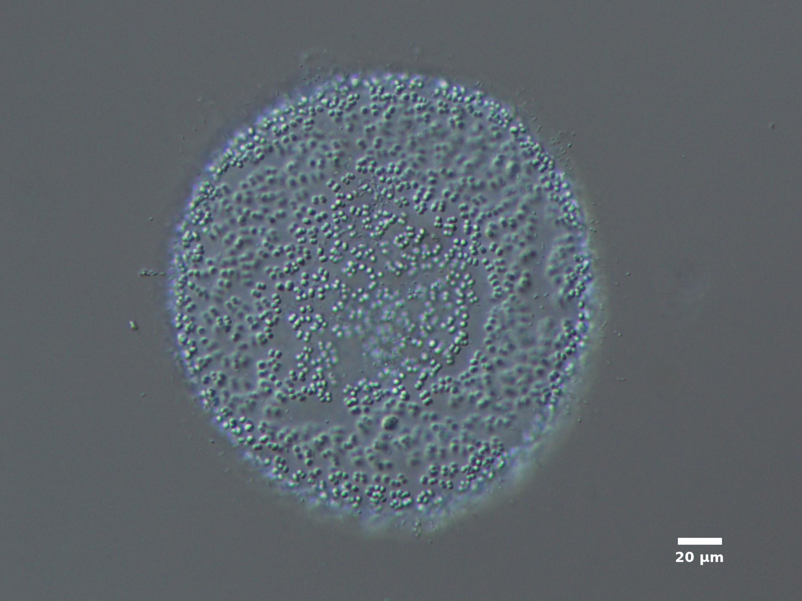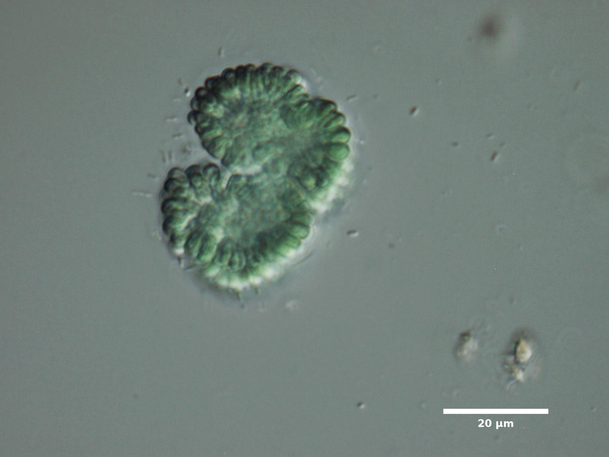 F3. CELL WIDTH ≥3 µm; SPHERICAL OR BROADLY OVAL, BRIGHT BLUE-GREEN; ARRANGED IN SINGLE LAYER AROUND HOLLOW COLONY CENTER; COLONIES SPHERICAL: