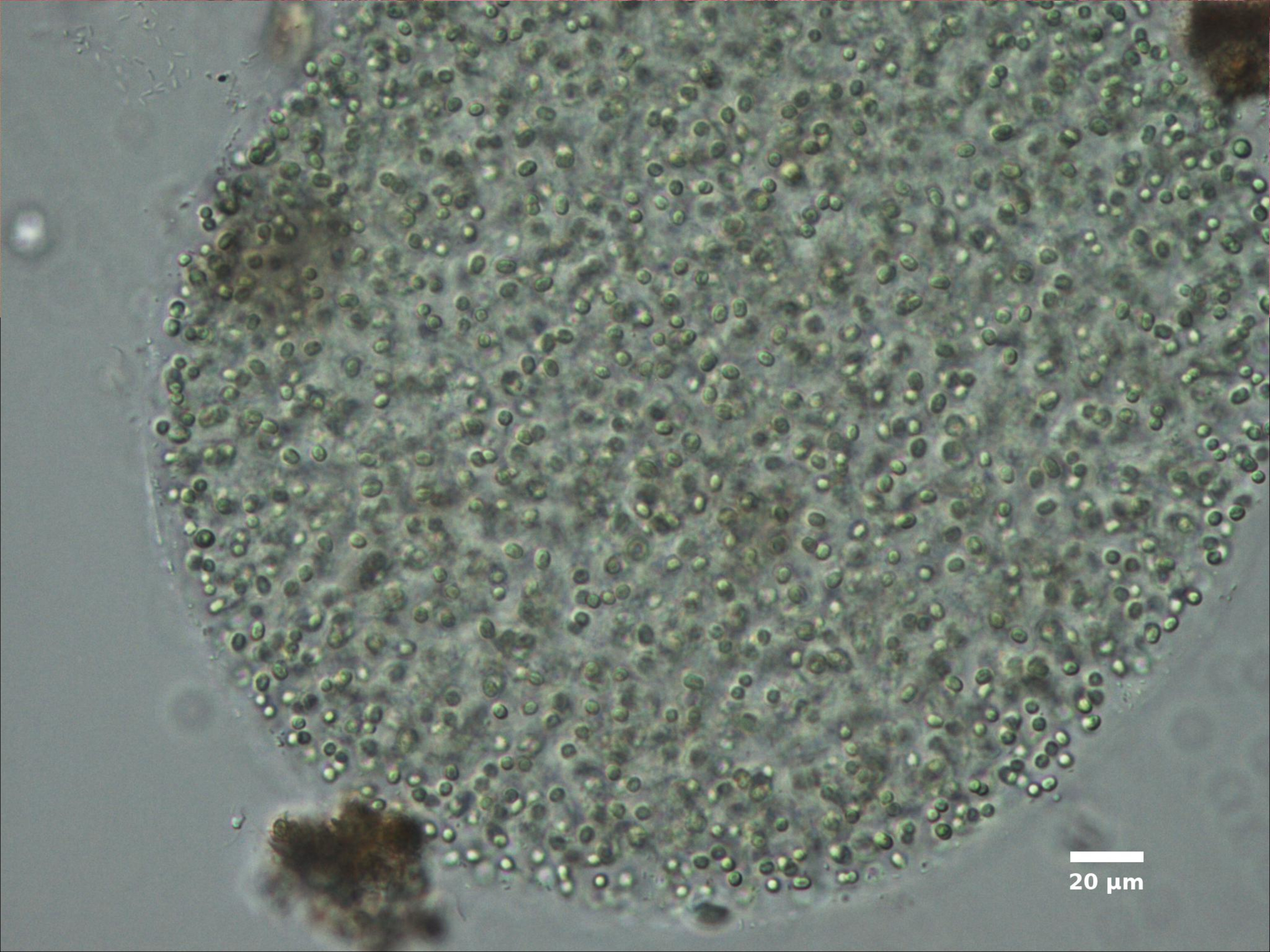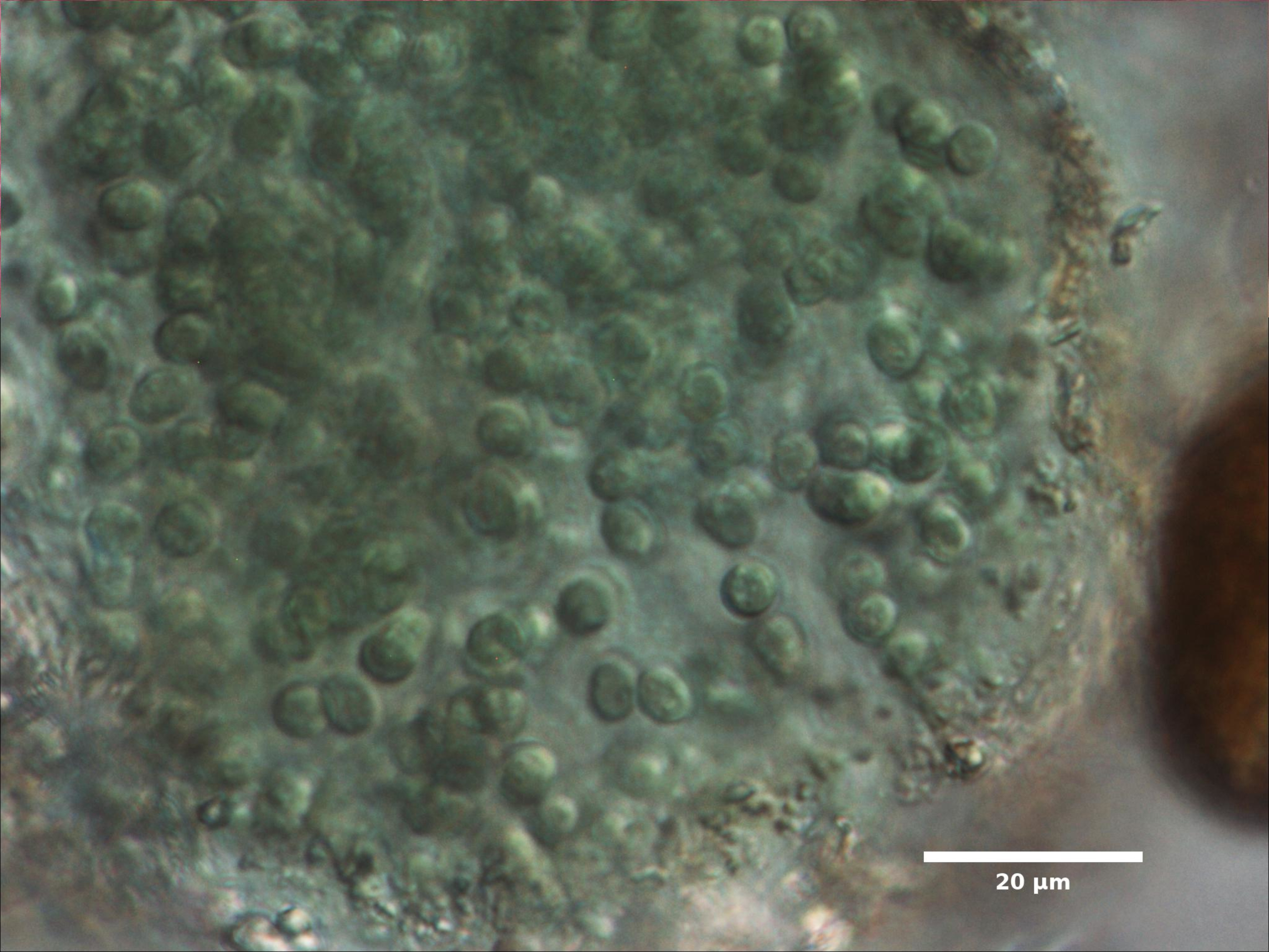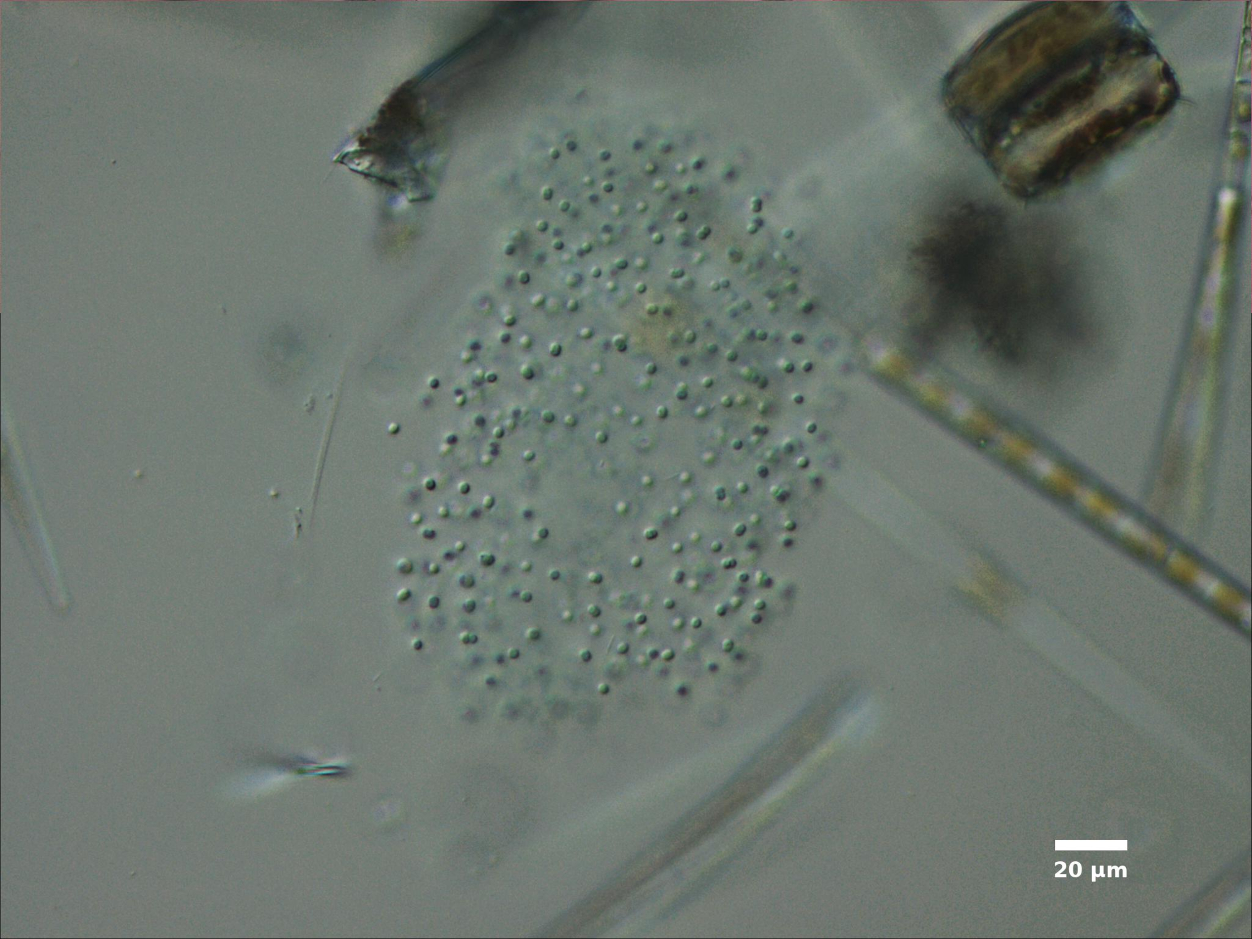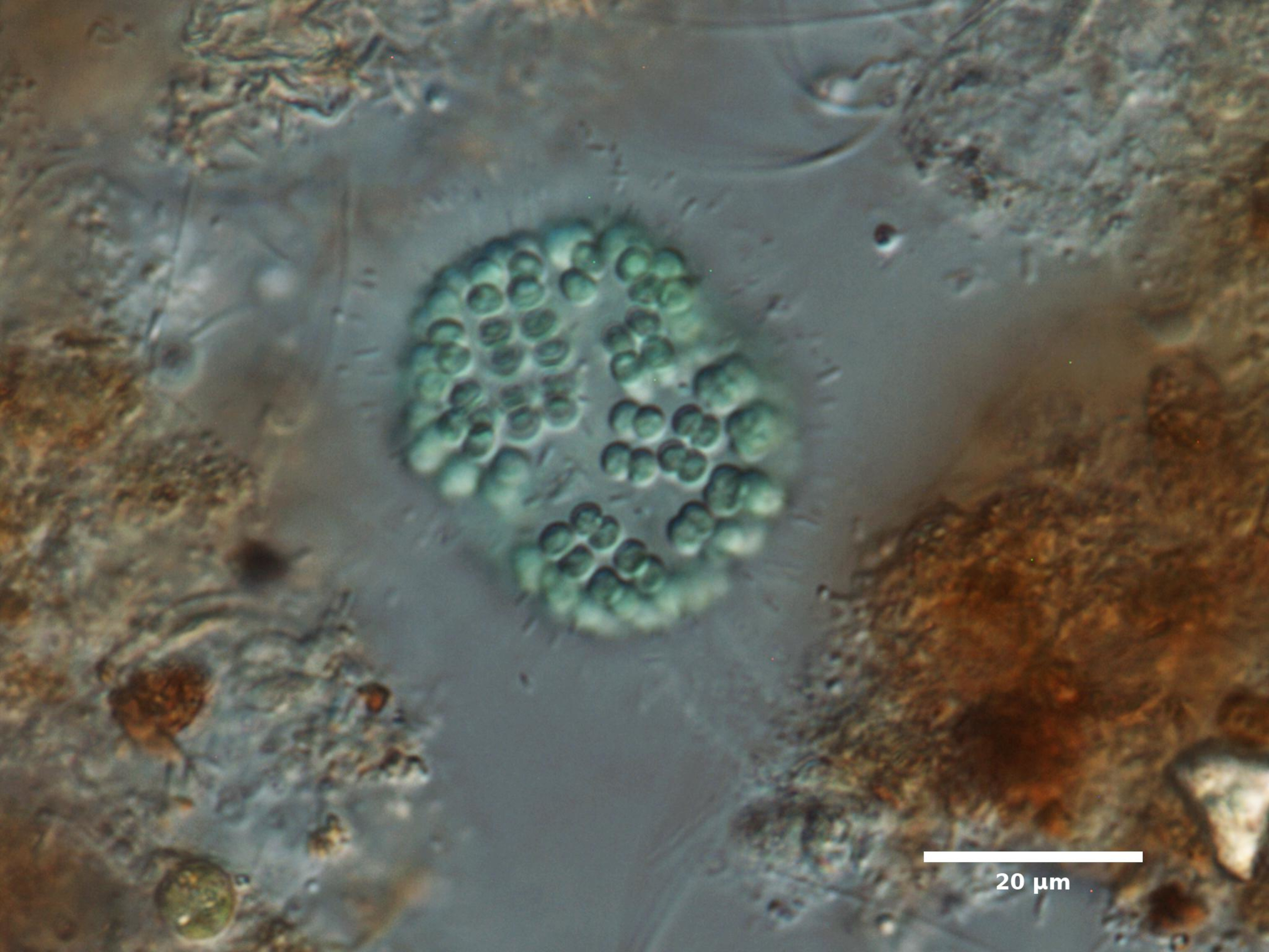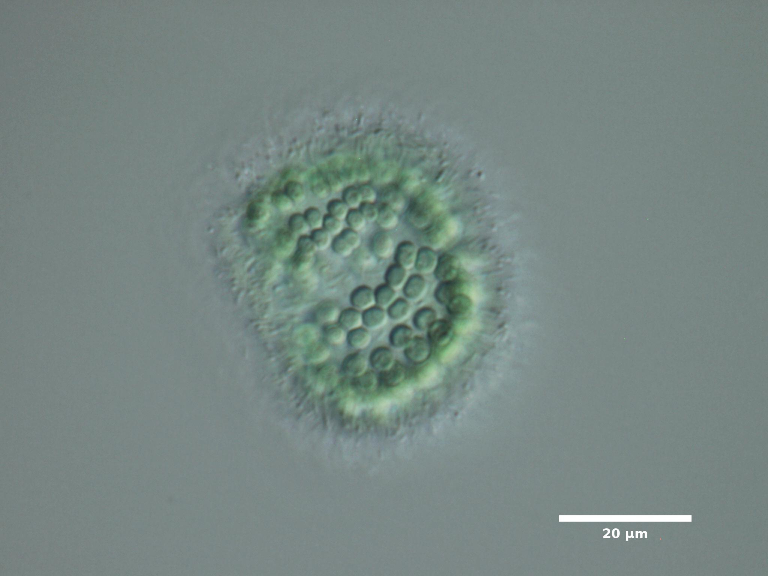 F3. CELL WIDTH ≥3 µm; SPHERICAL OR BROADLY OVAL, BRIGHT BLUE-GREEN; ARRANGED IN SINGLE LAYER AROUND HOLLOW COLONY CENTER; COLONIES SPHERICAL: