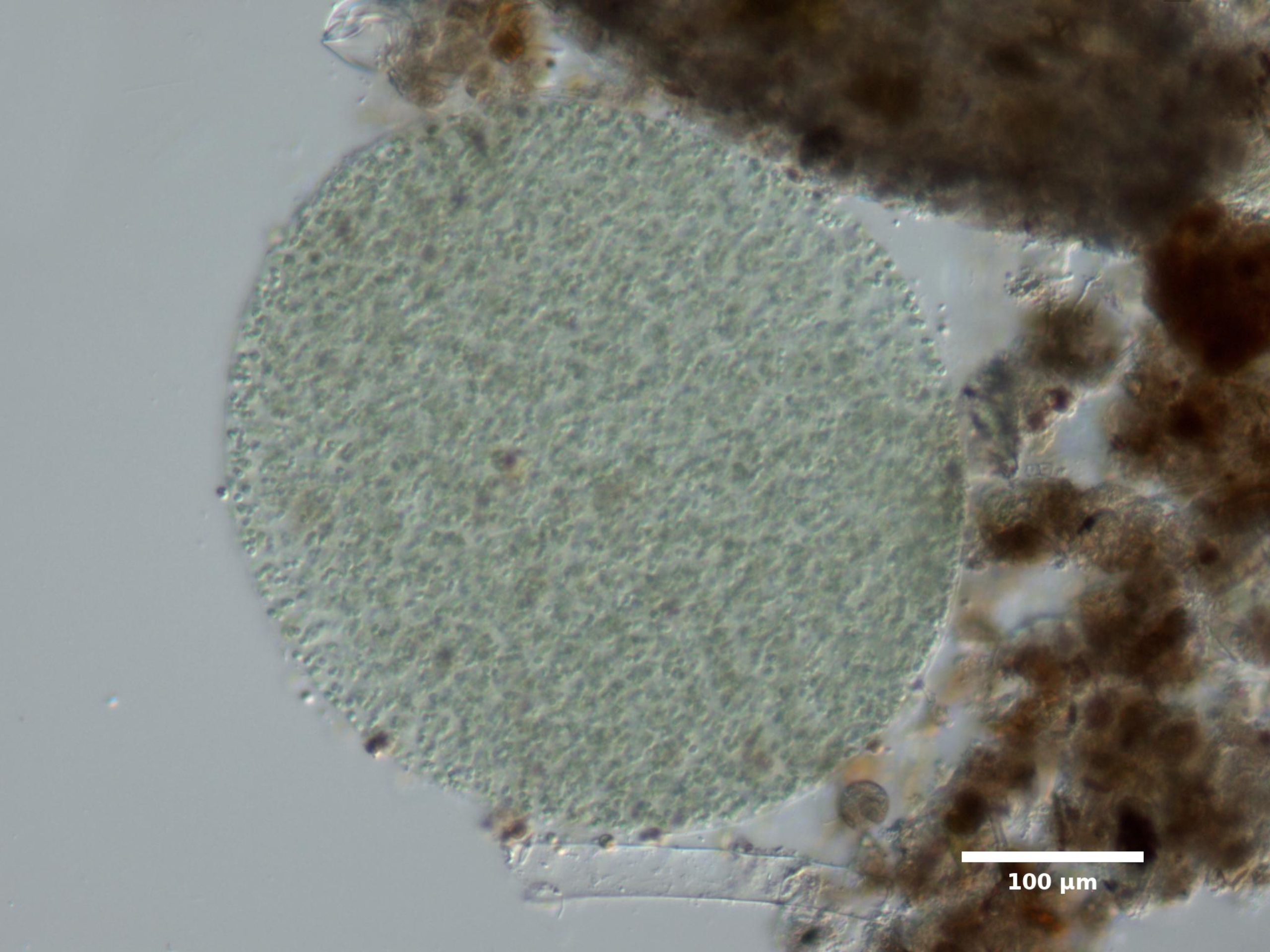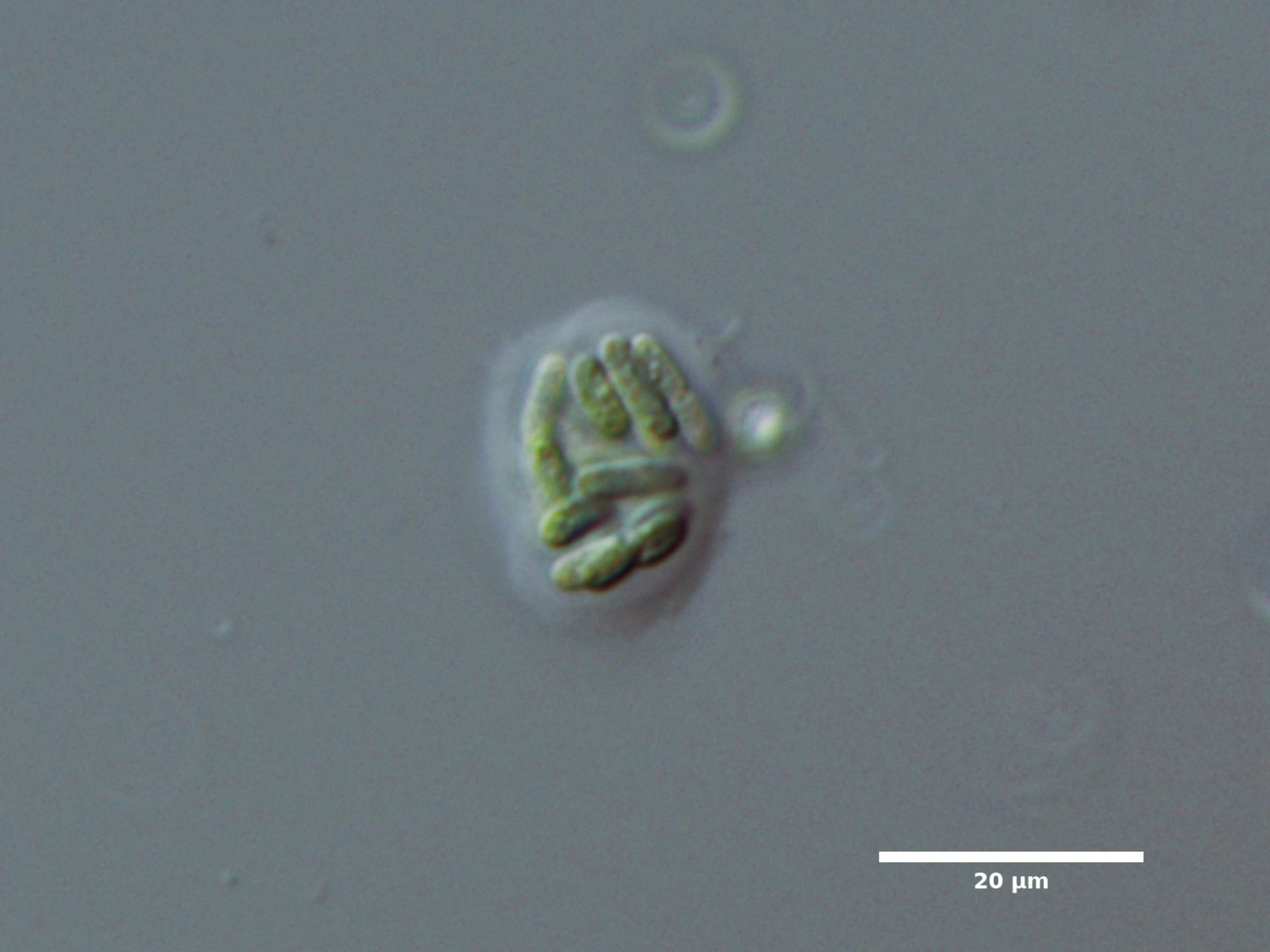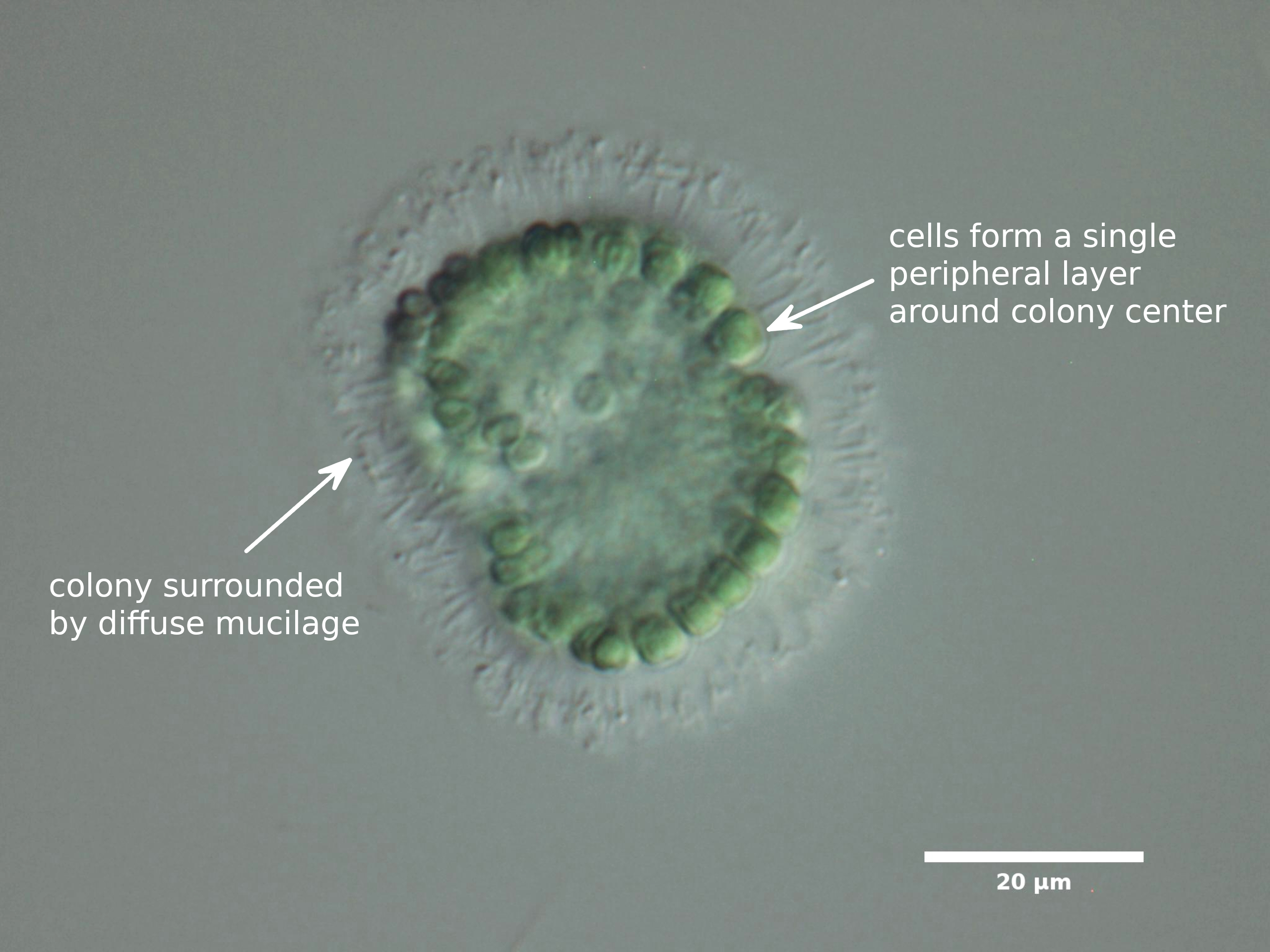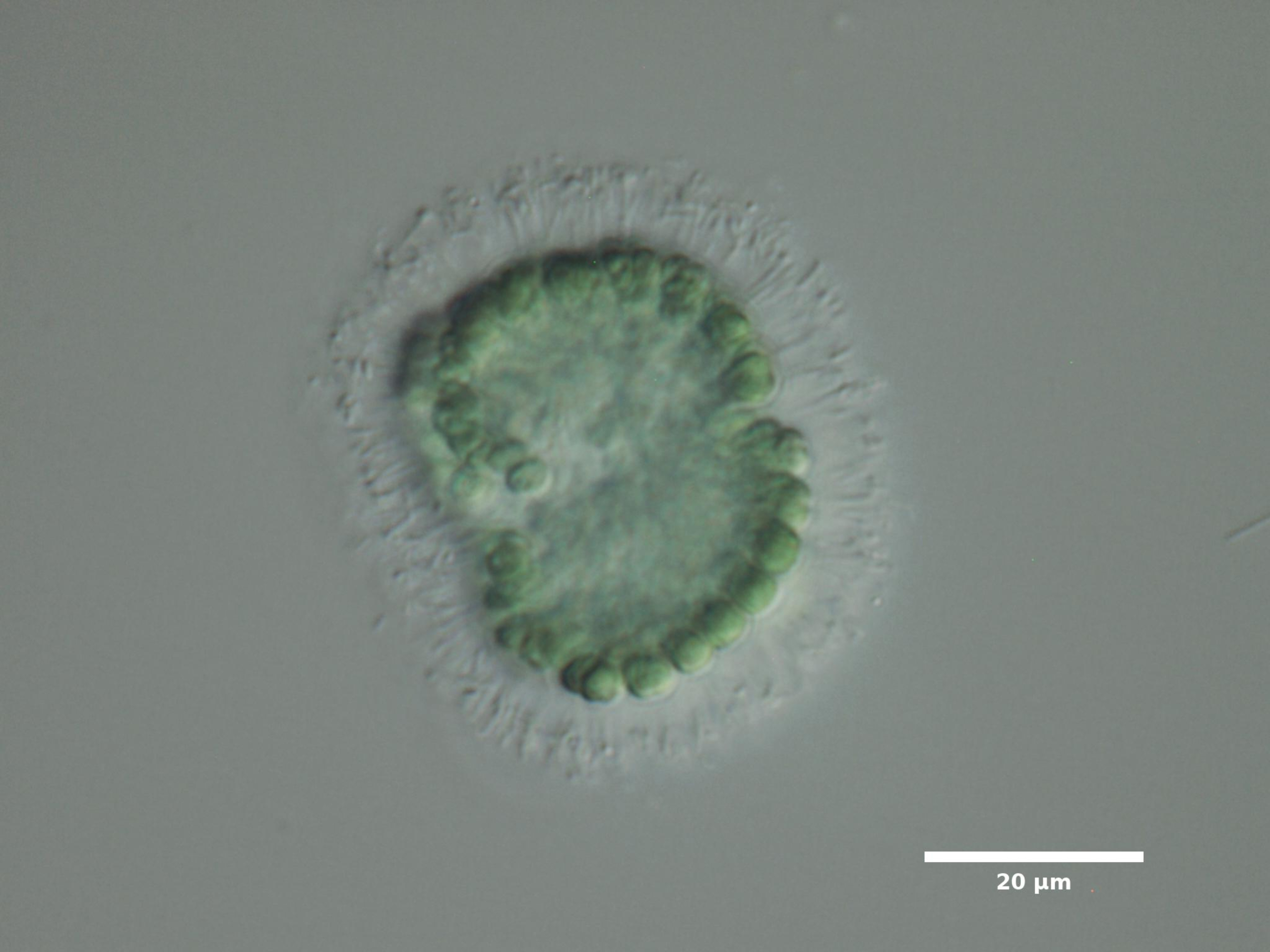 F3. CELL WIDTH ≥3 µm; SPHERICAL OR BROADLY OVAL, BRIGHT BLUE-GREEN; ARRANGED IN SINGLE LAYER AROUND HOLLOW COLONY CENTER; COLONIES SPHERICAL: