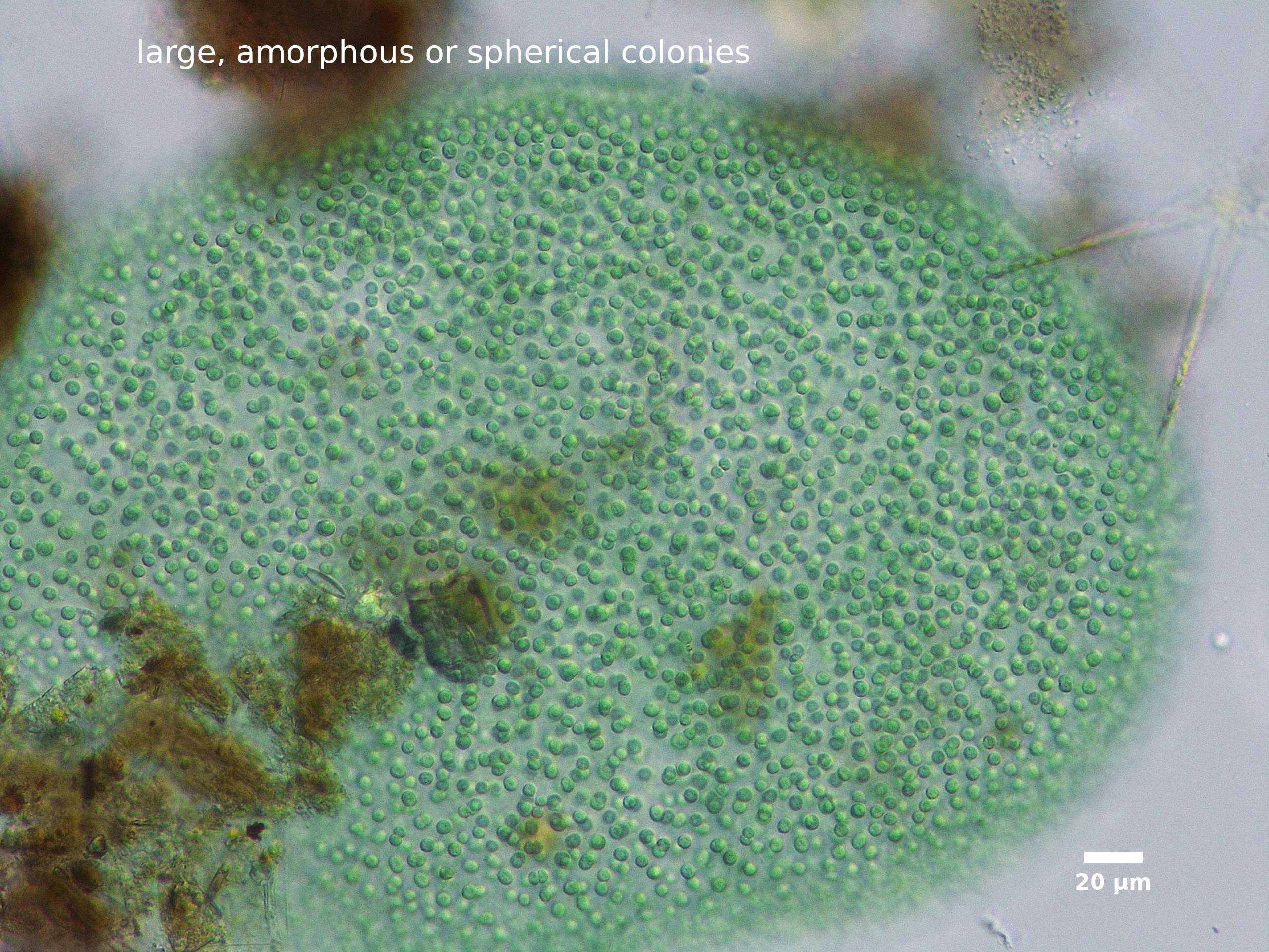 F4. CELLS SPHERICAL, OVAL, OR ELLIPTICAL, BLUE-GRAY, GRAY, GREEN, OR BROWNISH; LOOSELY DISTRIBUTED IN AMORPHOUS OR SPHERICAL COLONIES, USUALLY SURROUNDED BY DIFFUSE MUCILAGE: