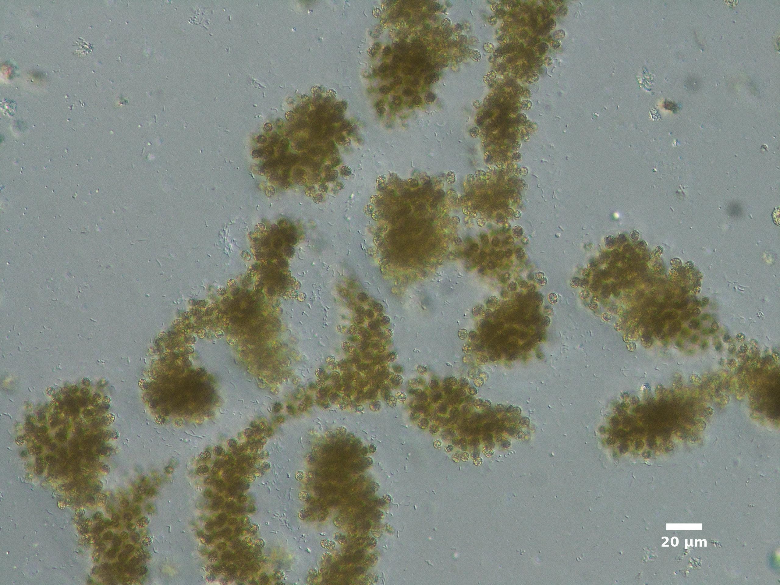 E2. CELLS FORM AT END OF THICK, RADIATING MUCILAGE STRANDS THAT ARE RARELY VISIBLE; COLONIES INITIALLY SPHERICAL, BECOMING IRREGULAR WITH AGE: