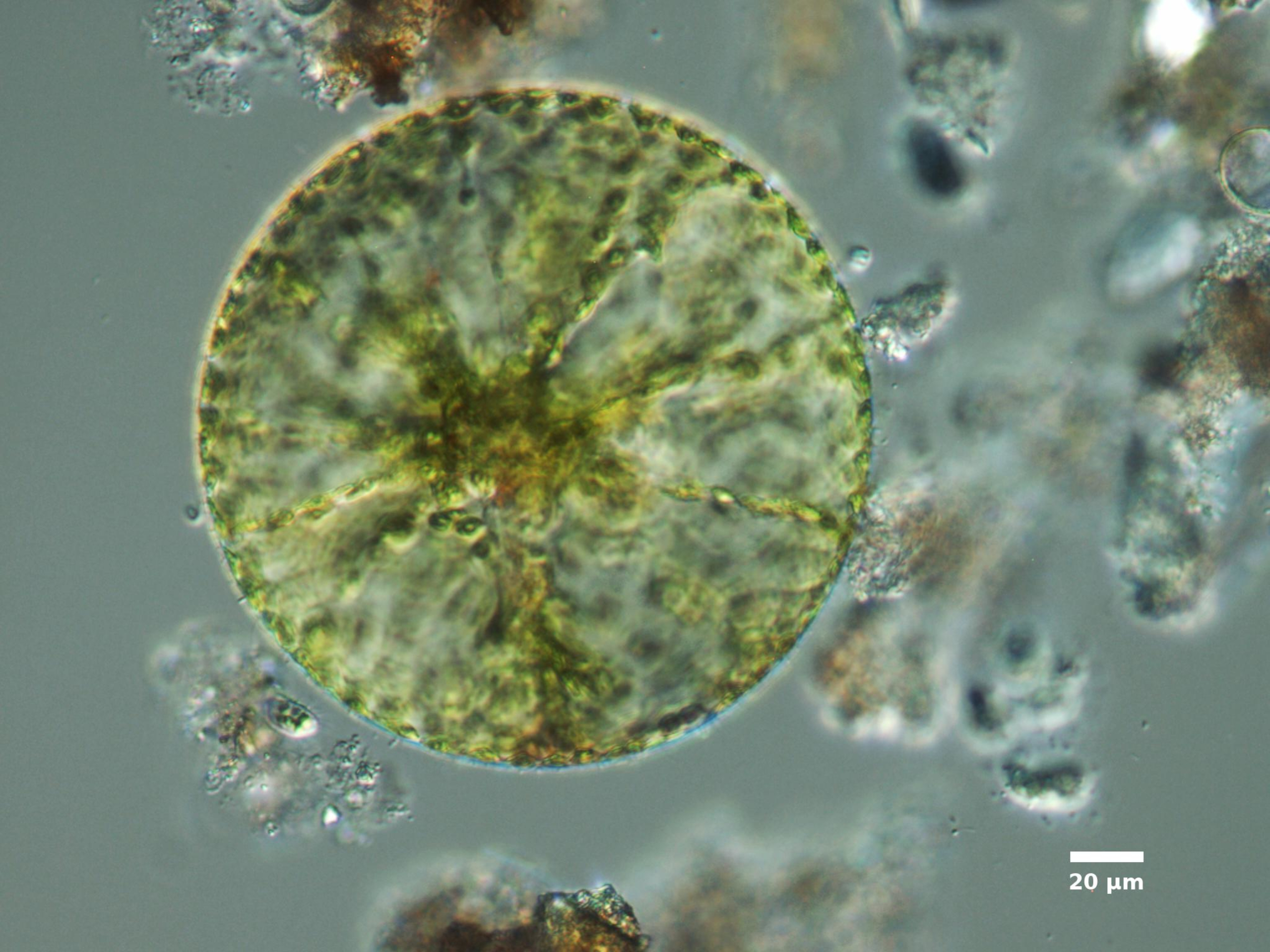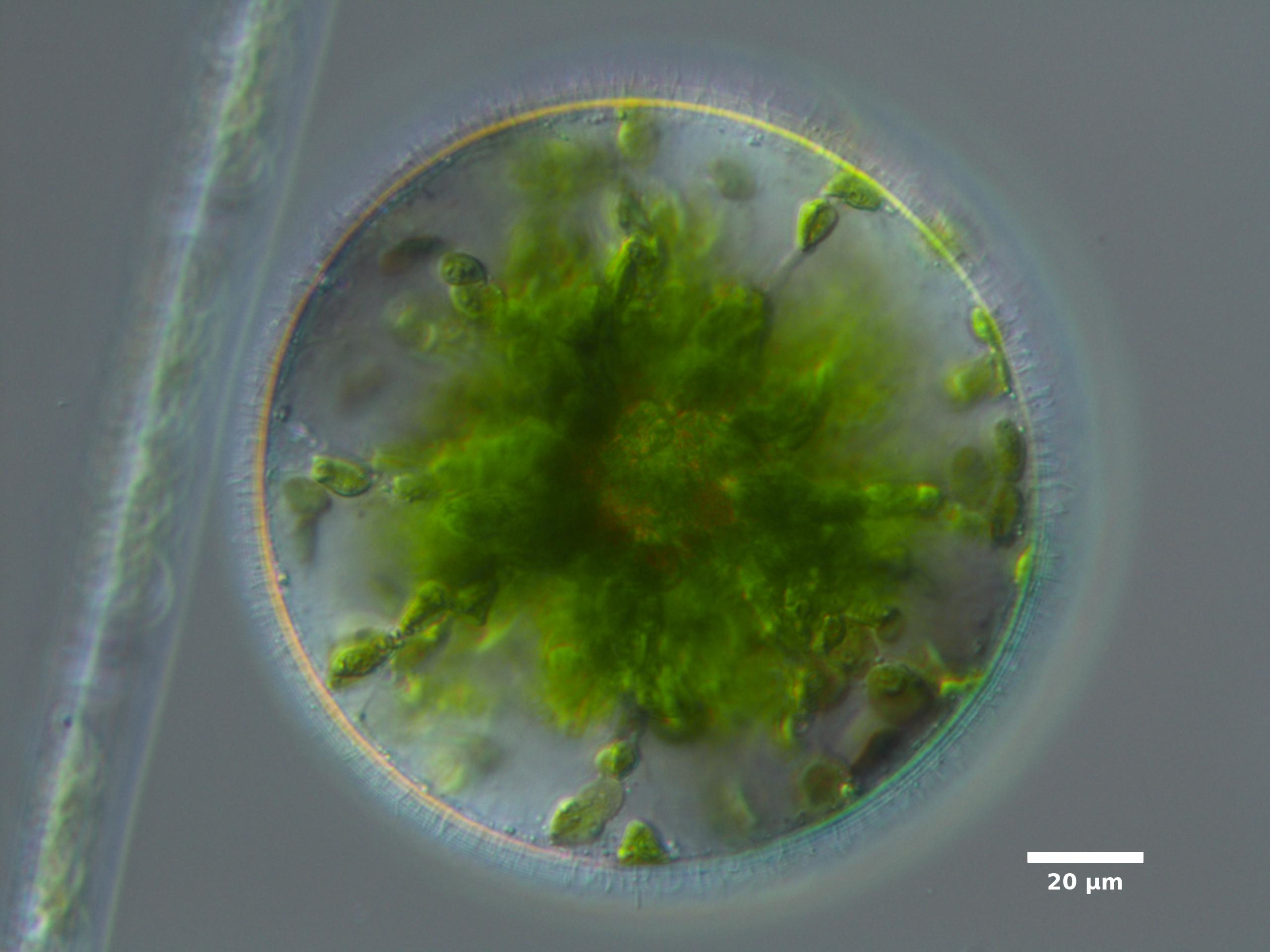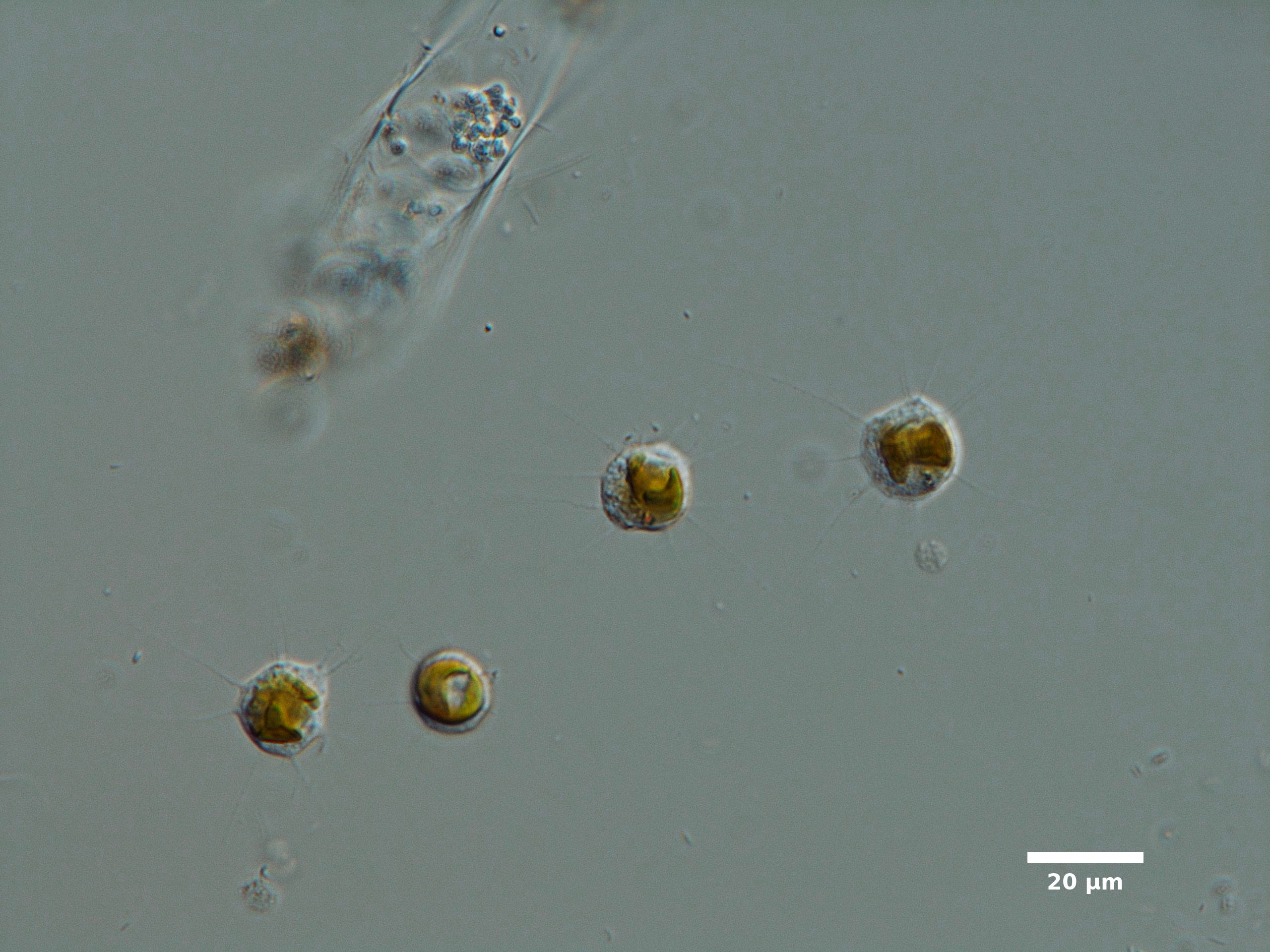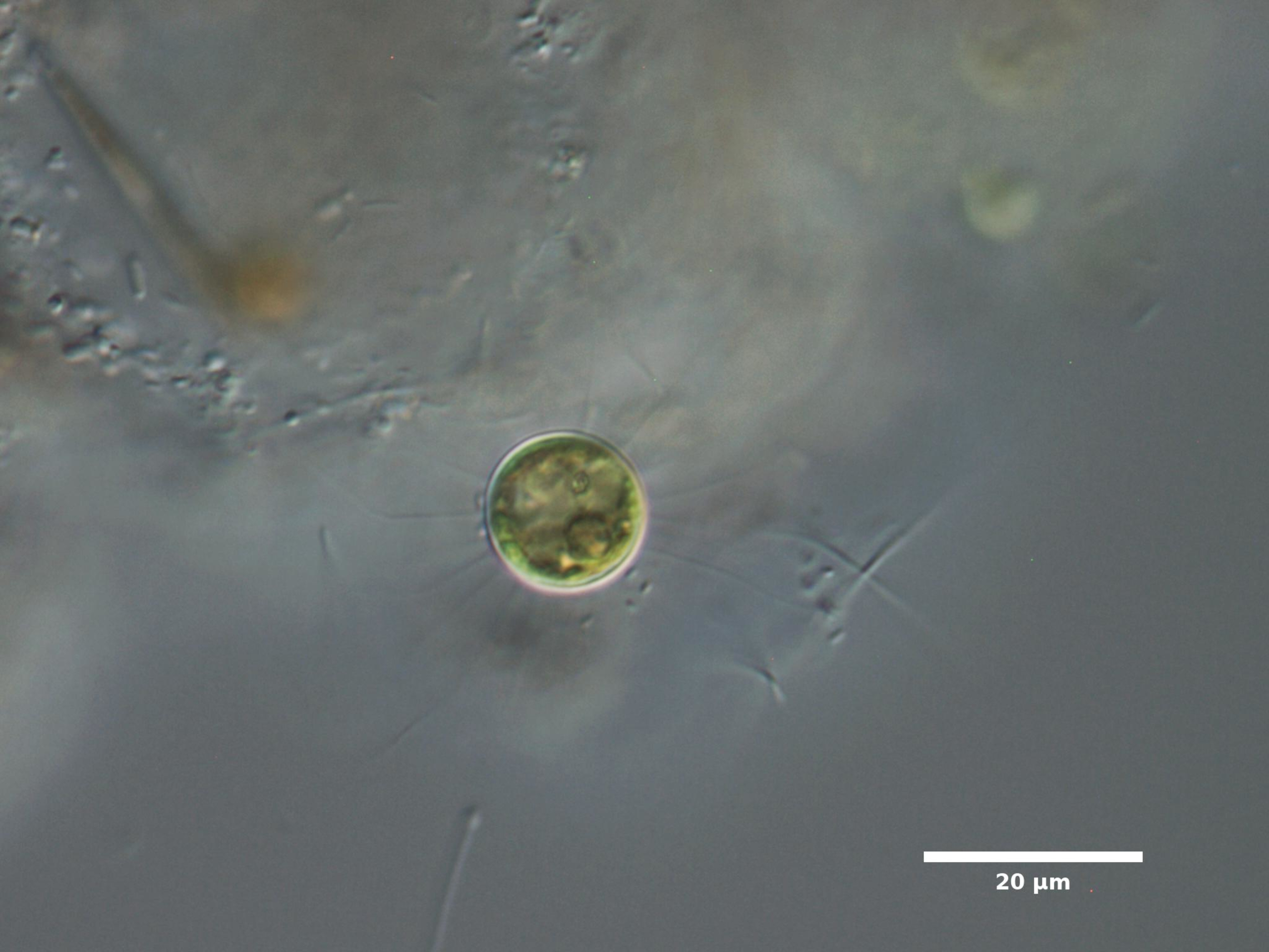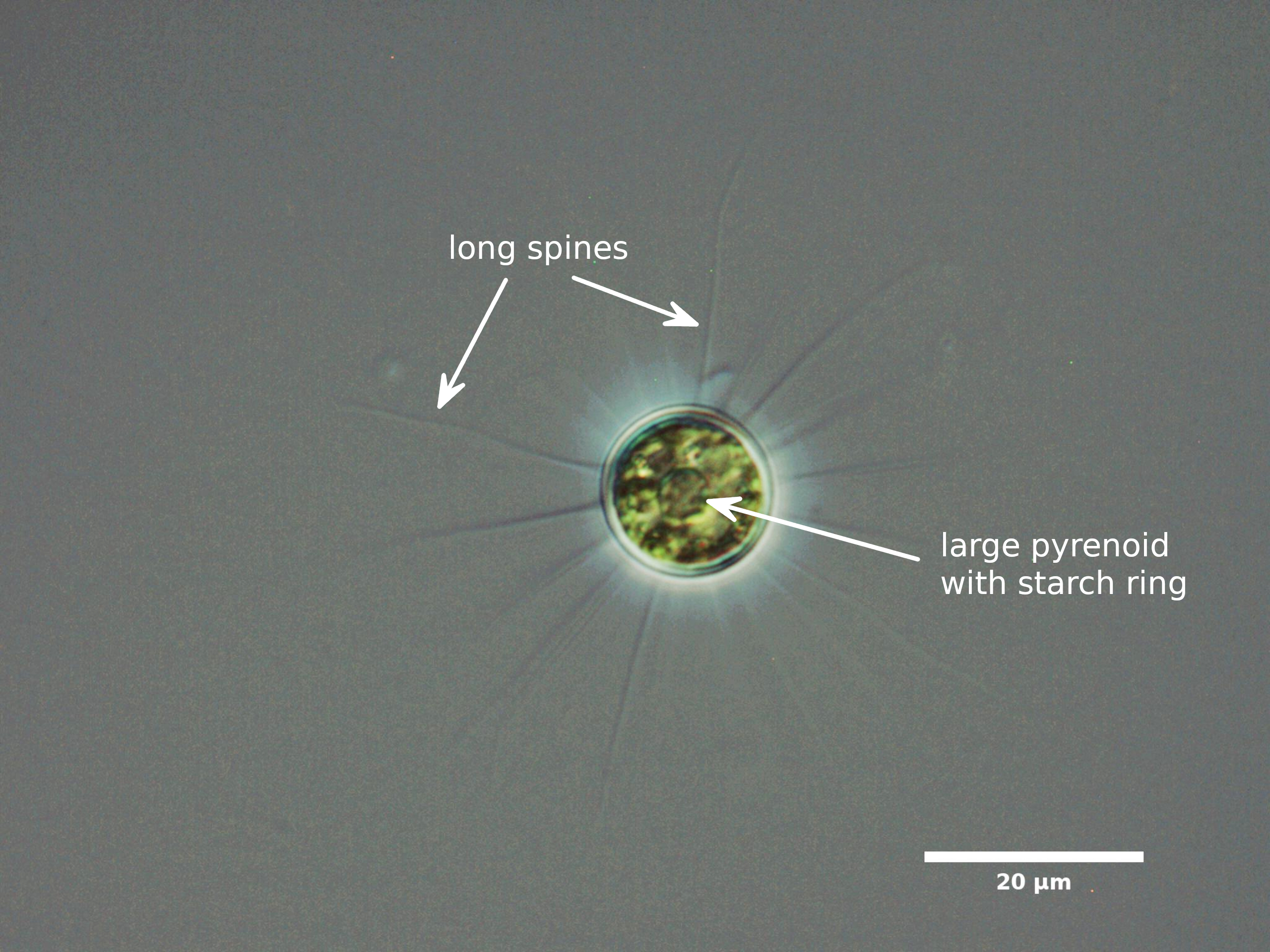 E2. CELLS SPHERICAL WITH MANY LONG THIN SPINES; CHLOROPLAST CONTAINS LARGE CENTRAL PYRENOID WITH STARCH RING: