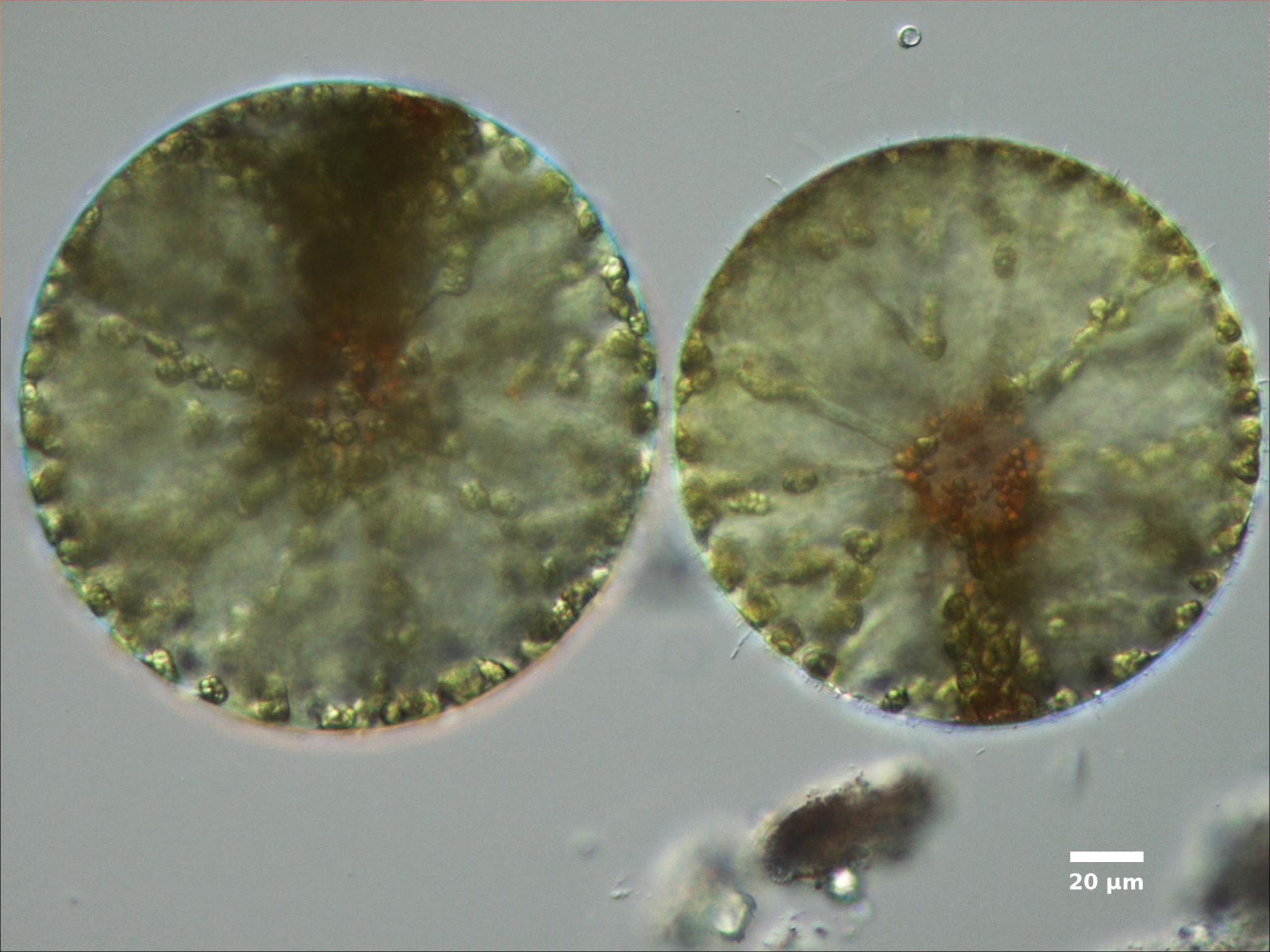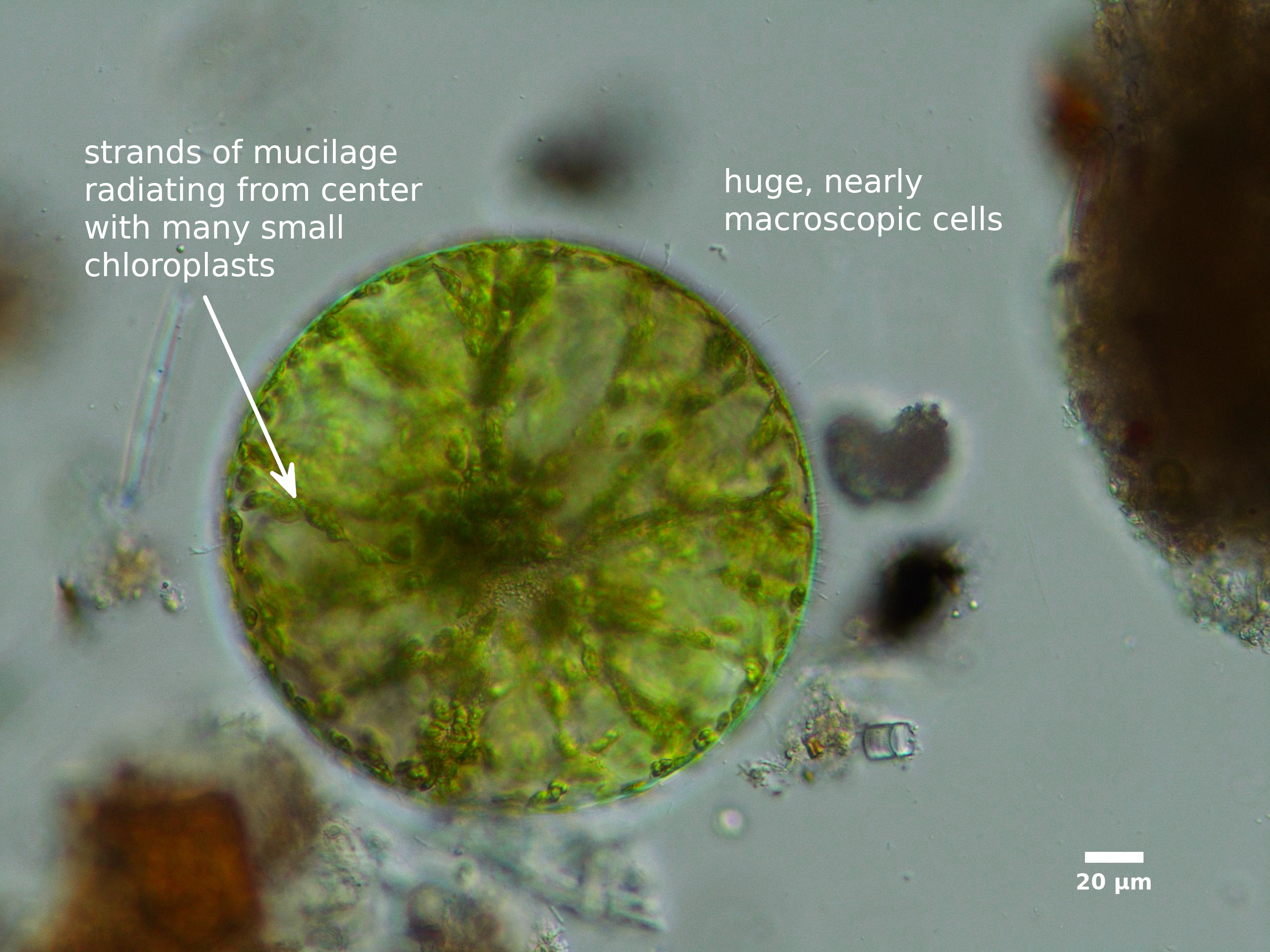 E3. CELLS VERY LARGE, SPHERICAL, WITH MANY SMALL CHLOROPLASTS ATTACHED TO INTERNAL STRANDS OF MUCILAGE RADIATING FROM CENTER OF CELL: