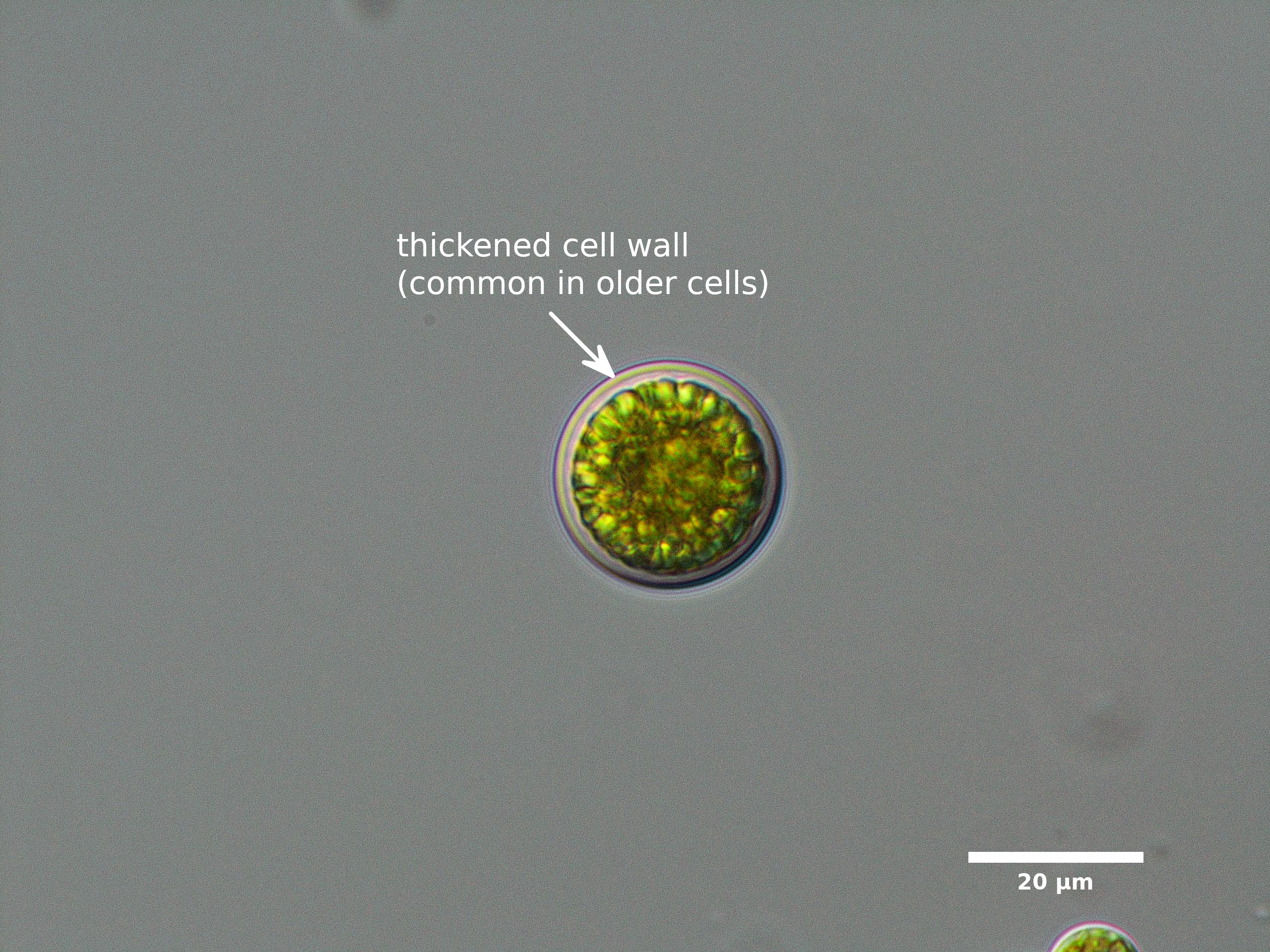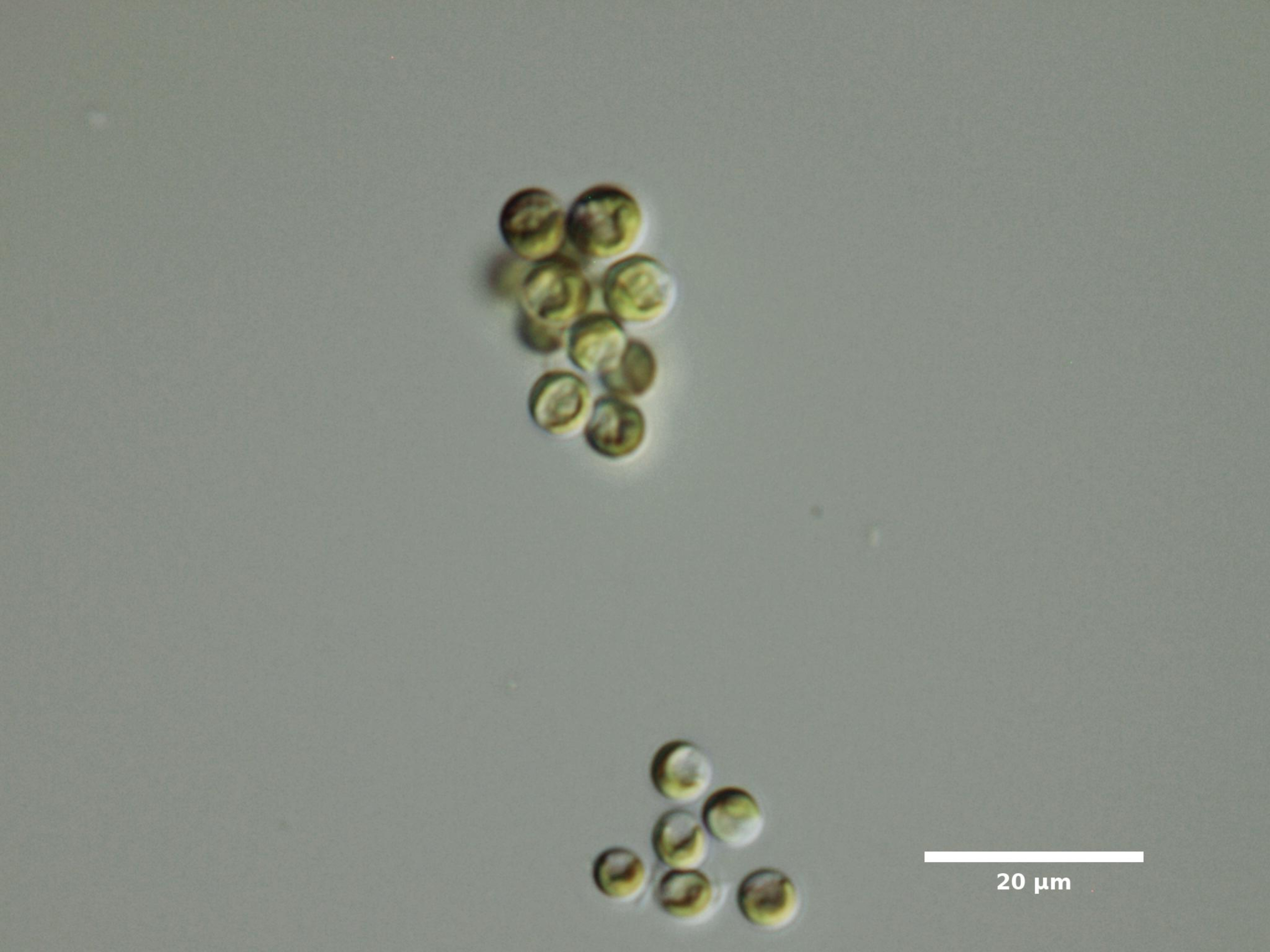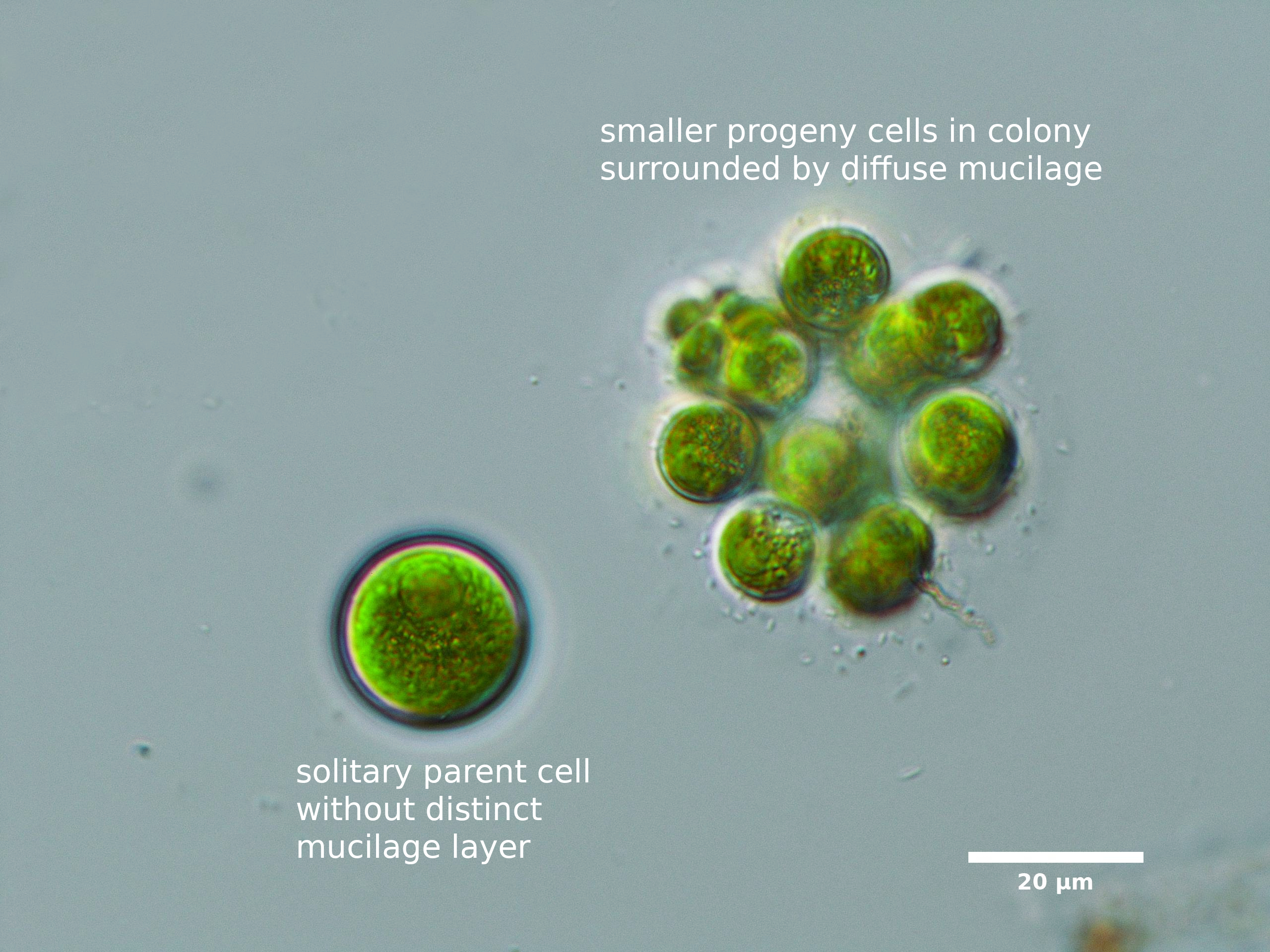 E5. SPHERICAL OR NEARLY SPHERICAL, DULL OR BRIGHT GREEN CELLS WITH DENSE (NOT STAR-SHAPED) CHLOROPLAST; SOLITARY OR IN SMALL TO LARGE SIZED COLONIES; CELLS MAY OR MAY NOT BE SURROUNDED BY MUCILAGE; COLONIES USUALLY SURROUNDED BY DIFFUSE MUCILAGE:
