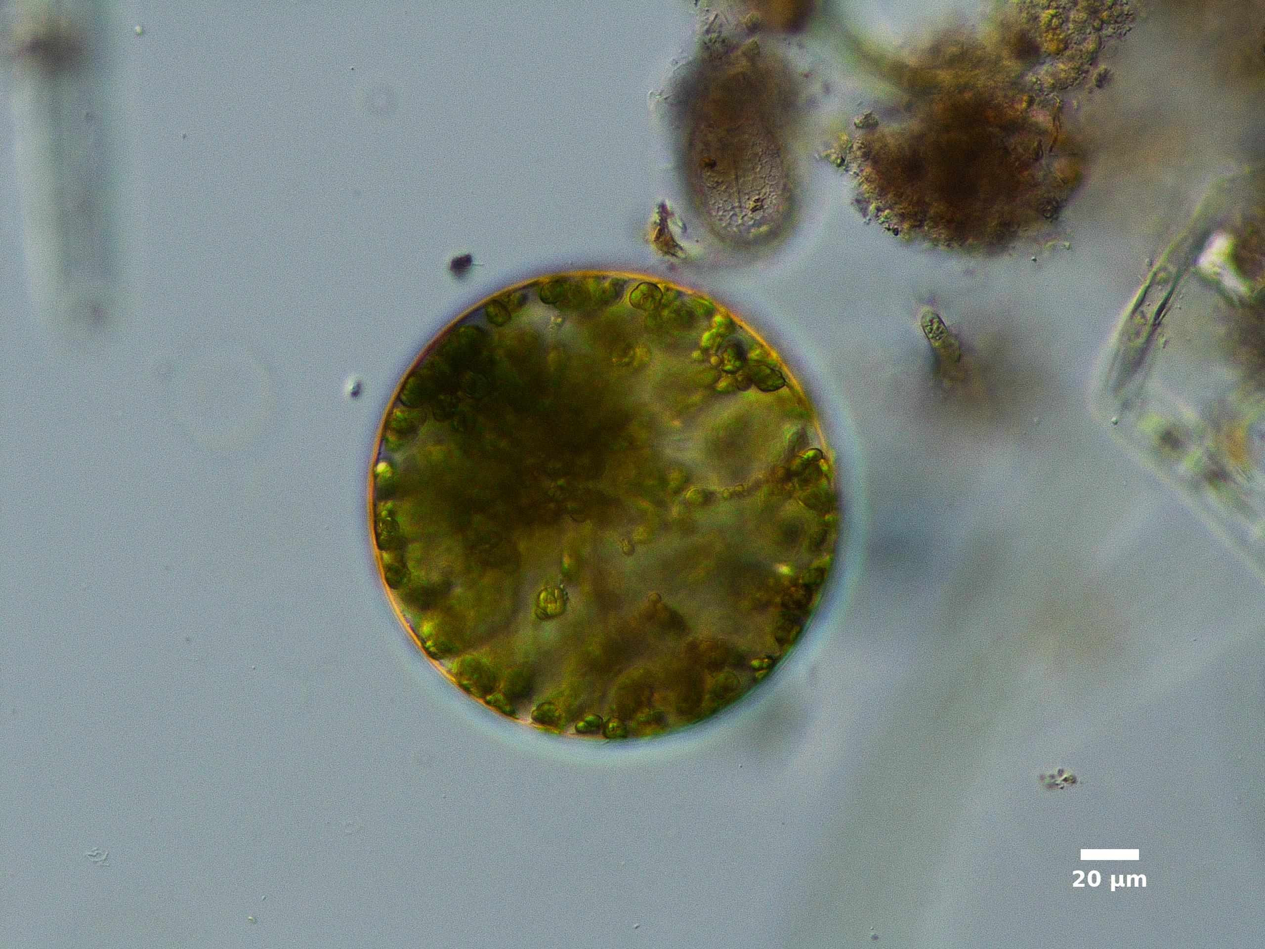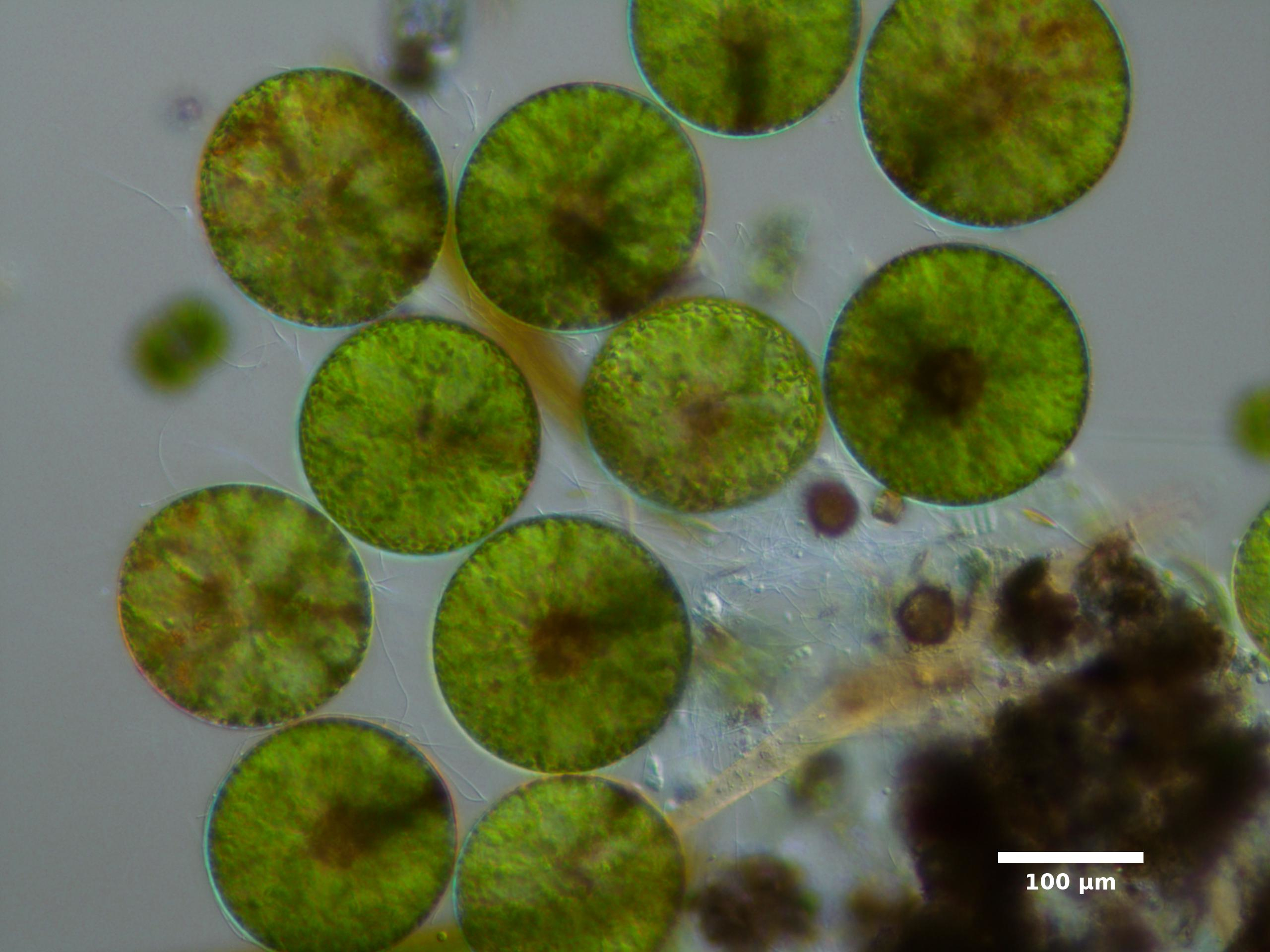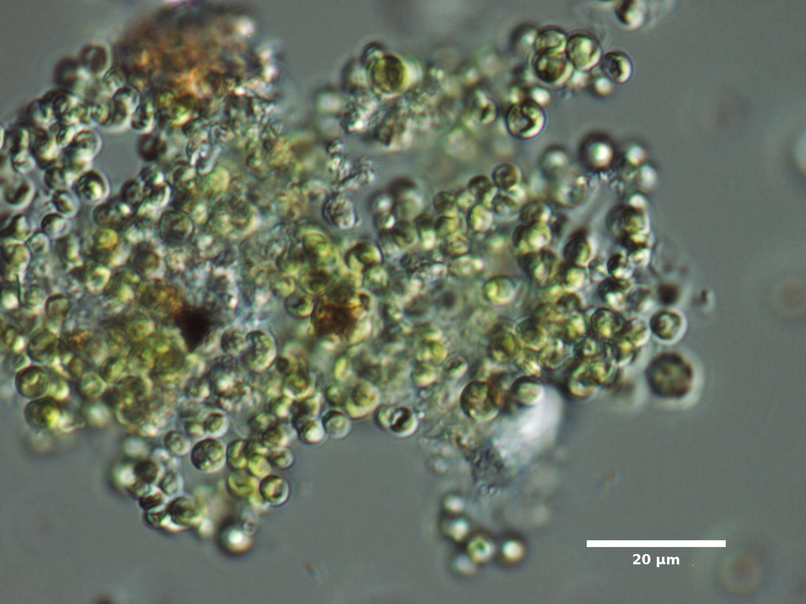 E5. SPHERICAL OR NEARLY SPHERICAL, DULL OR BRIGHT GREEN CELLS WITH DENSE (NOT STAR-SHAPED) CHLOROPLAST; SOLITARY OR IN SMALL TO LARGE SIZED COLONIES; CELLS MAY OR MAY NOT BE SURROUNDED BY MUCILAGE; COLONIES USUALLY SURROUNDED BY DIFFUSE MUCILAGE: