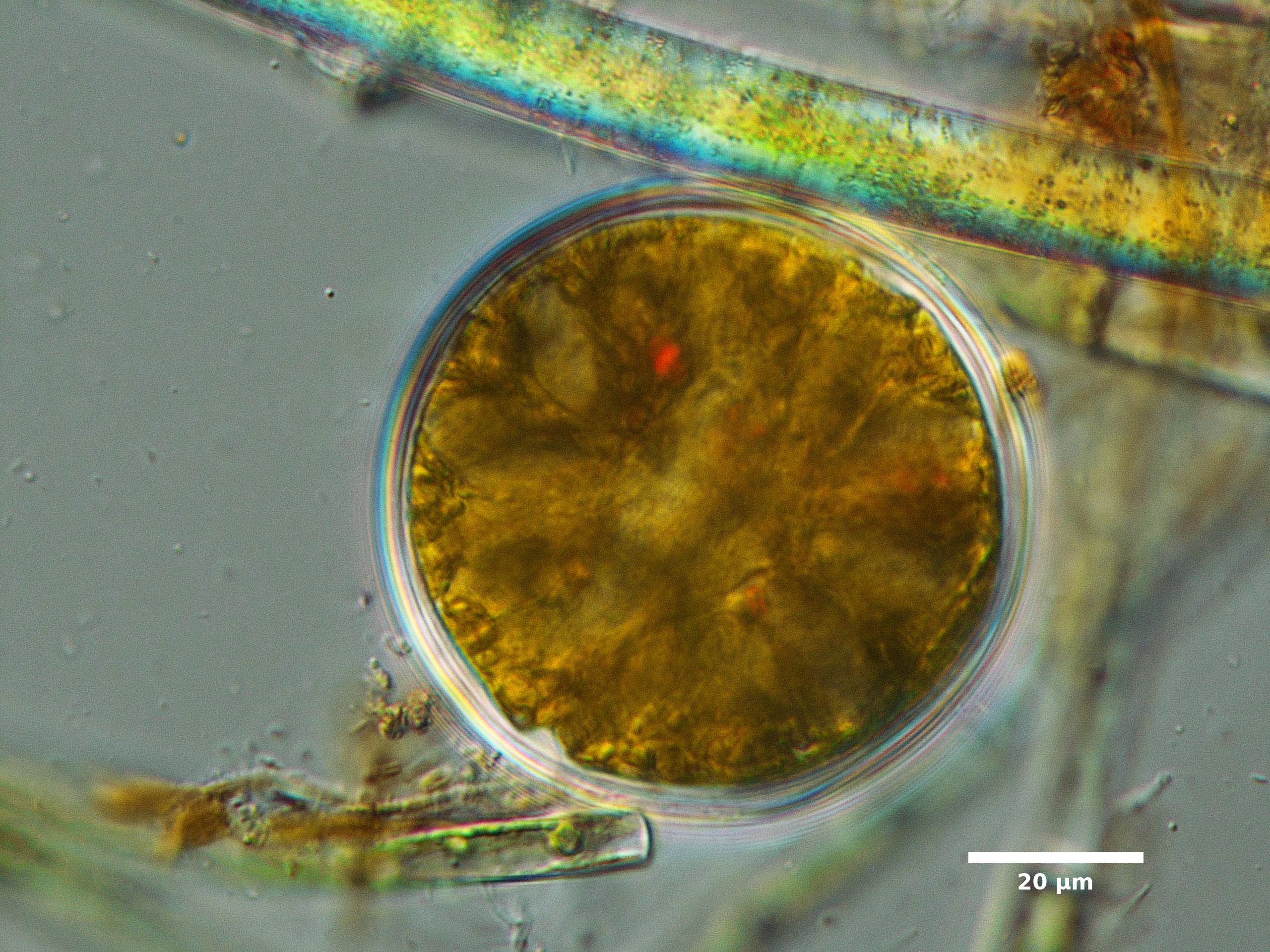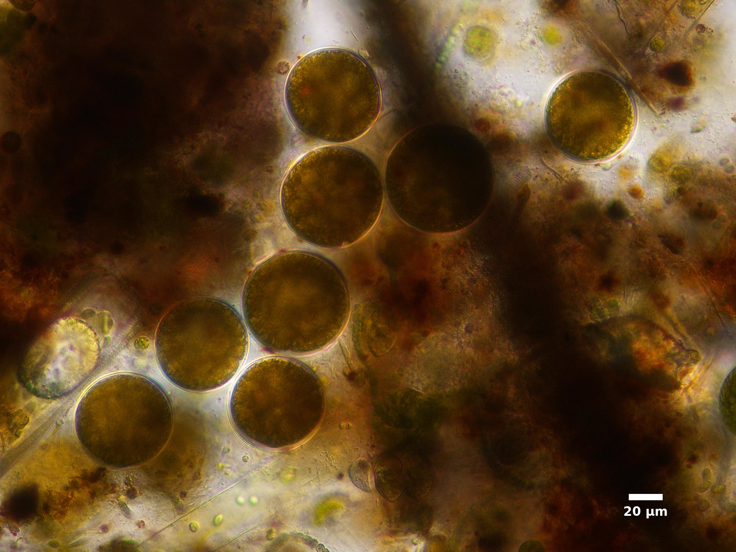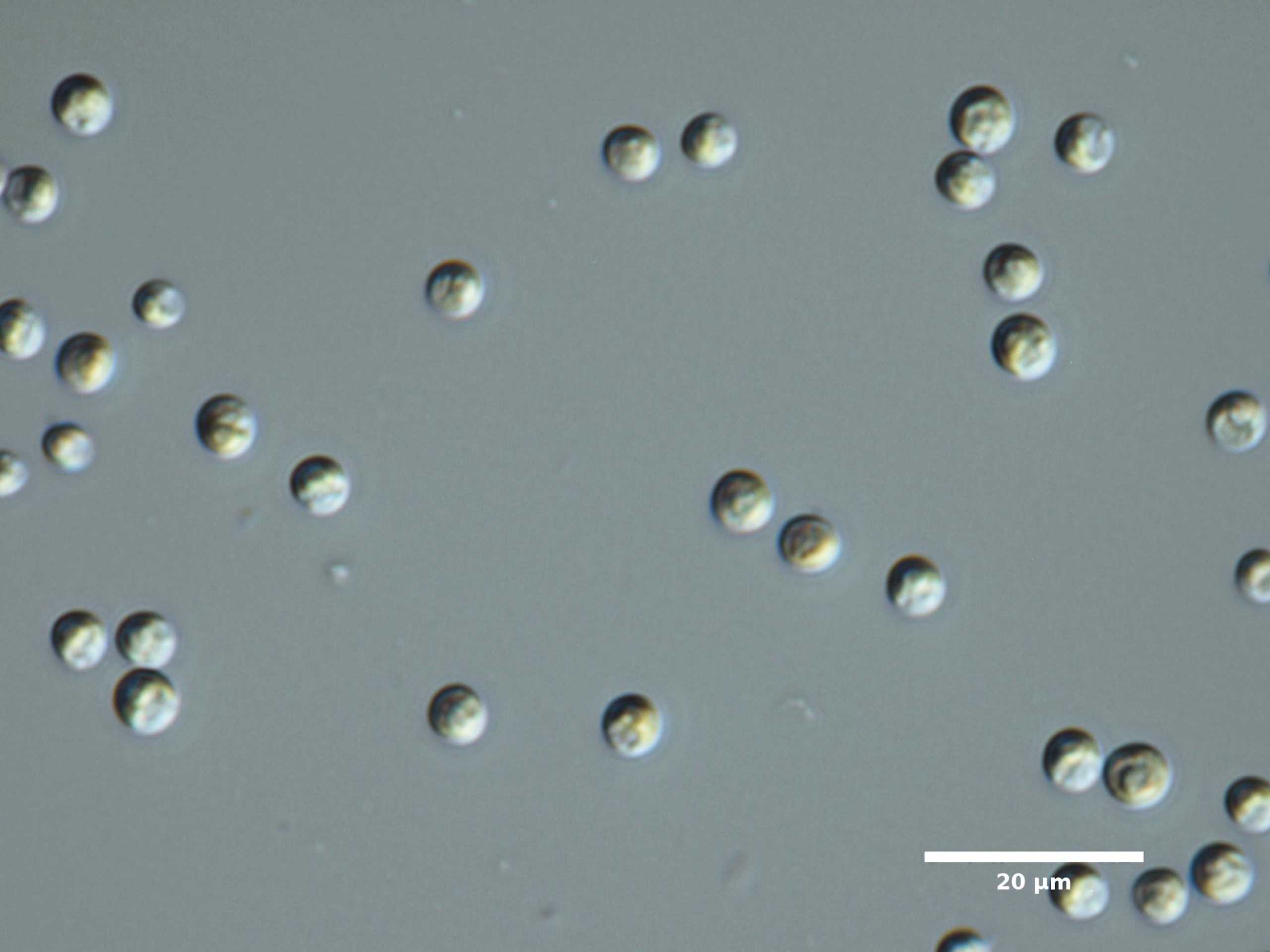 E6. SPHERICAL CELLS LACKING A VISIBLE MUCILAGE LAYER AND OTHER DISTINCTIVE FEATURES; CELLS STAIN DARK BROWN IN LUGOL'S SOLUTION INDICATING PRESENCE OF STARCH:
