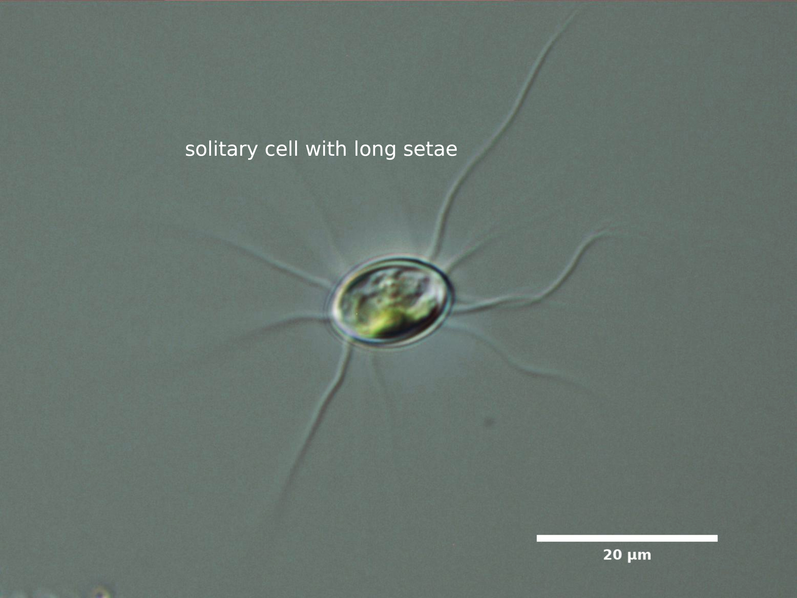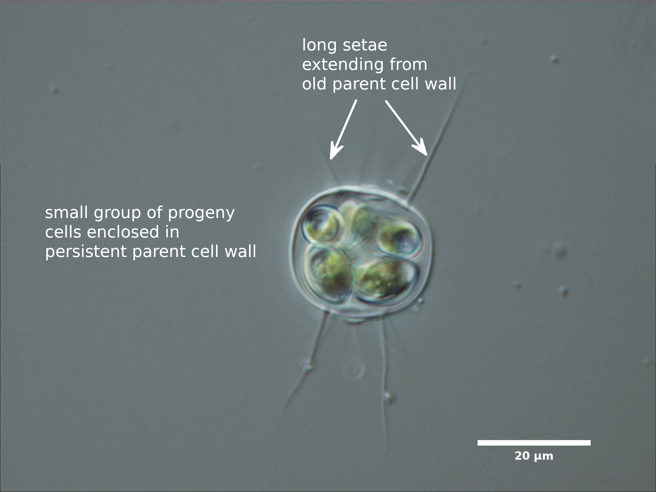E1. CELLS OVAL OR ELLIPTICAL, WITH LONG SETAE OR SPINES; SOLITARY OR IN SMALL COLONIES ENCLOSED IN OLD PARENT CELL WALL: