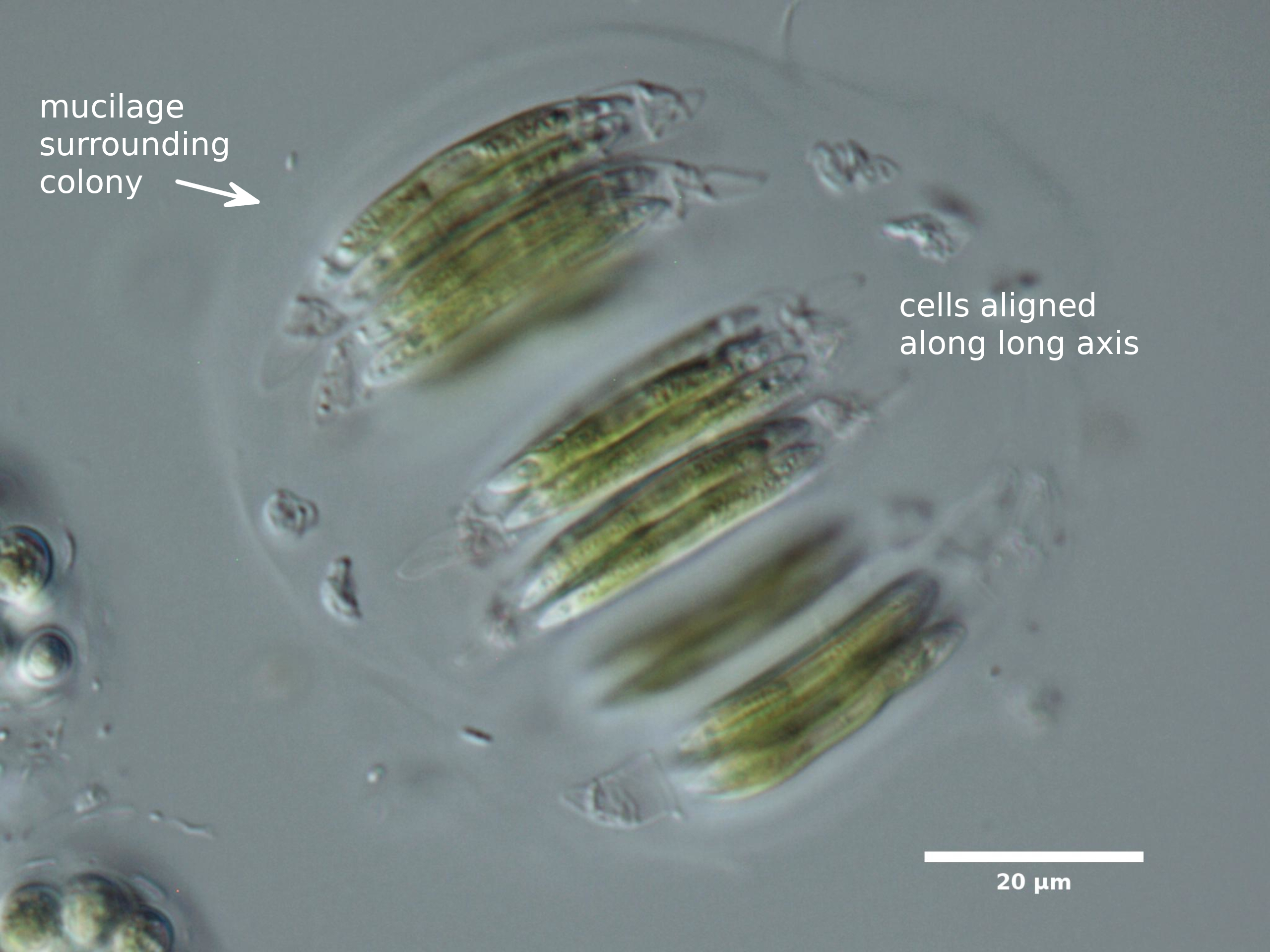 E4. CELLS BROADLY OR NARROWLY FUSIFORM; SOLITARY OR IN LENS-SHAPED COLONIES WITH CELLS OFFSET AND ALIGNED ALONG LONG AXIS; CELLS AND COLONIES ENCLOSED IN LENS-SHAPED MUCILAGE: