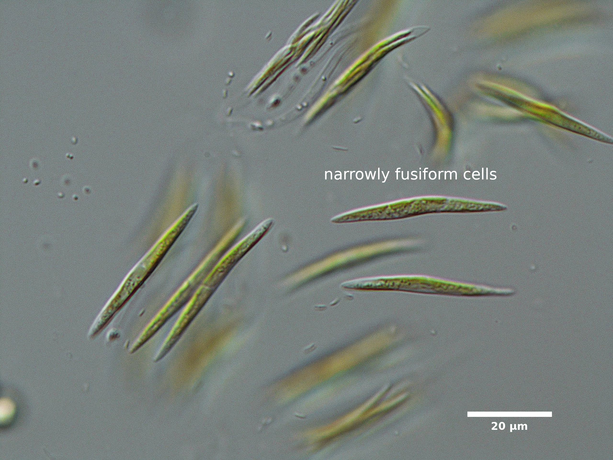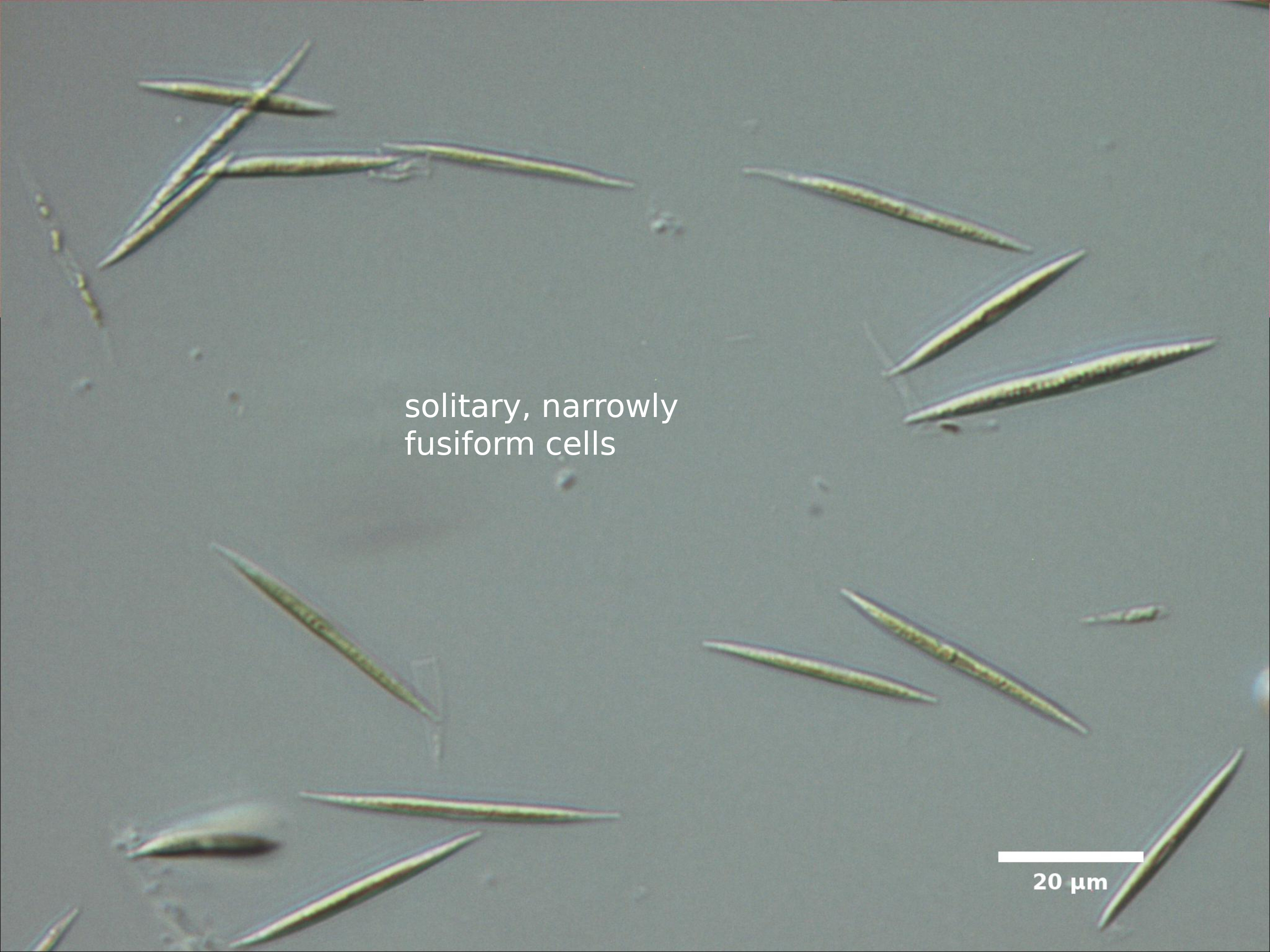 E6. CELLS NARROWLY FUSIFORM; SOLITARY; LACKING ANY VISIBLE MUCILAGE LAYER; MAY FORM BLOOMS: