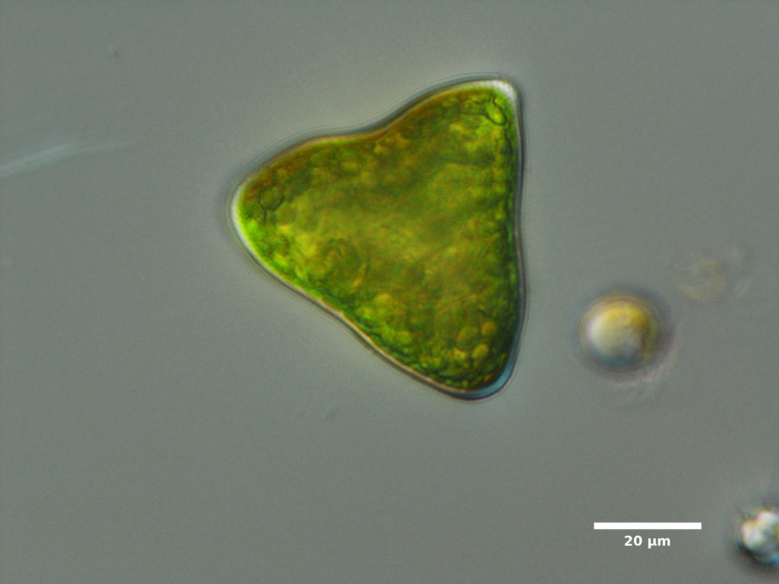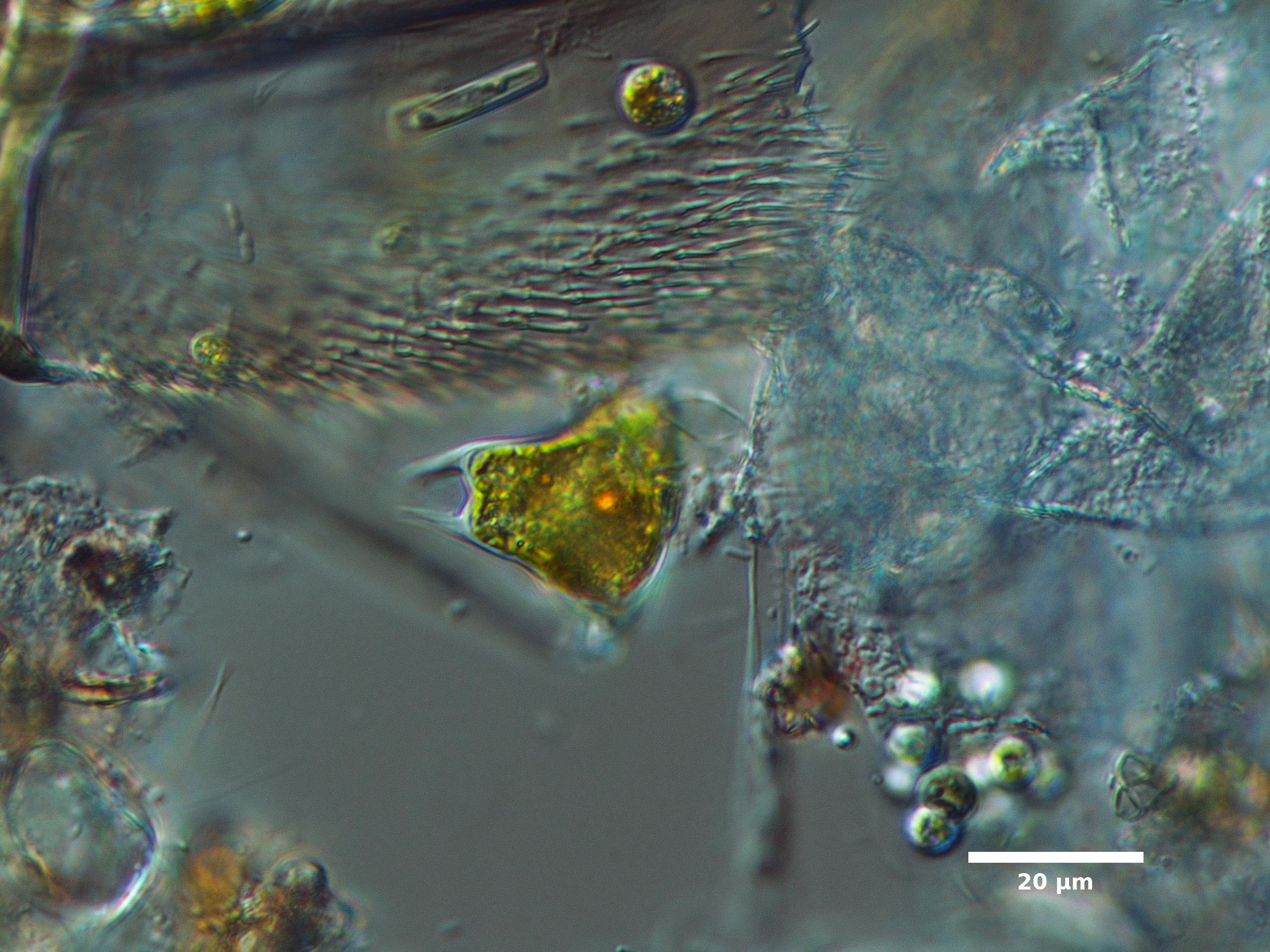 E4. CELLS IRREGULARLY TETRHEDRAL AND STRONGLY TWISTED, WITH SHORT ANGULAR TEETH; BRIGHT YELLOWISH GREEN: