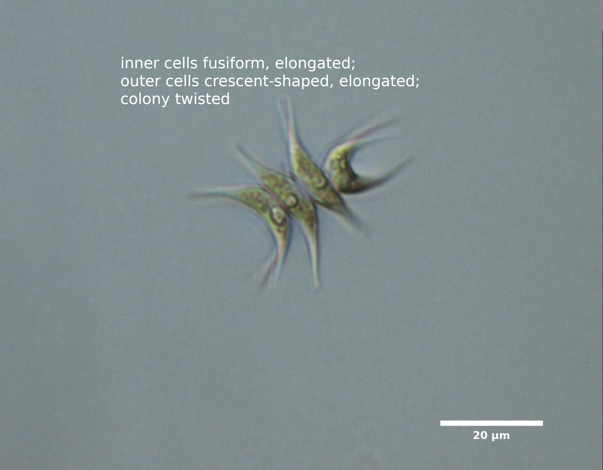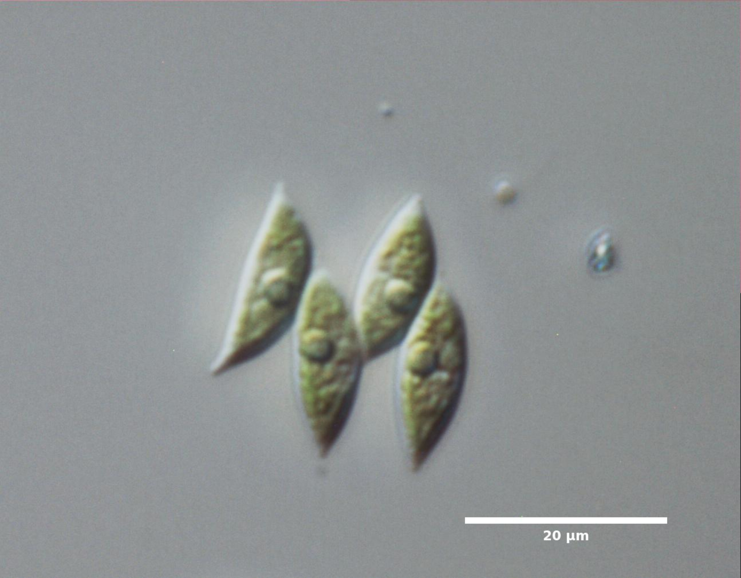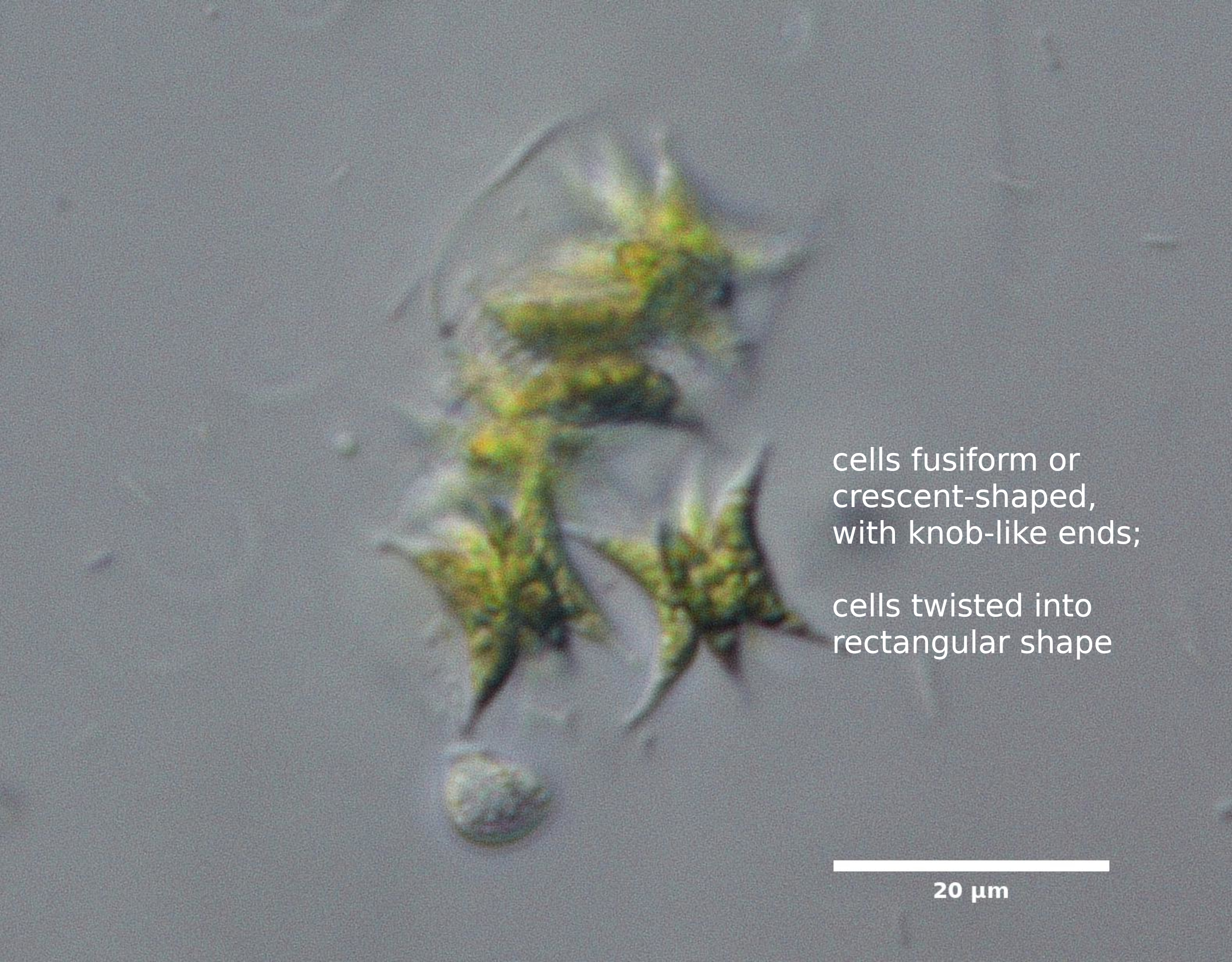 E1. CELLS FUSIFORM OR CRESCENT-SHAPED; APEX ACUTELY POINTED, WITHOUT SPINES BUT SOMETIMES WITH ROUNDED KNOBS; COLONIES TWISTED IN SOME SPECIES: