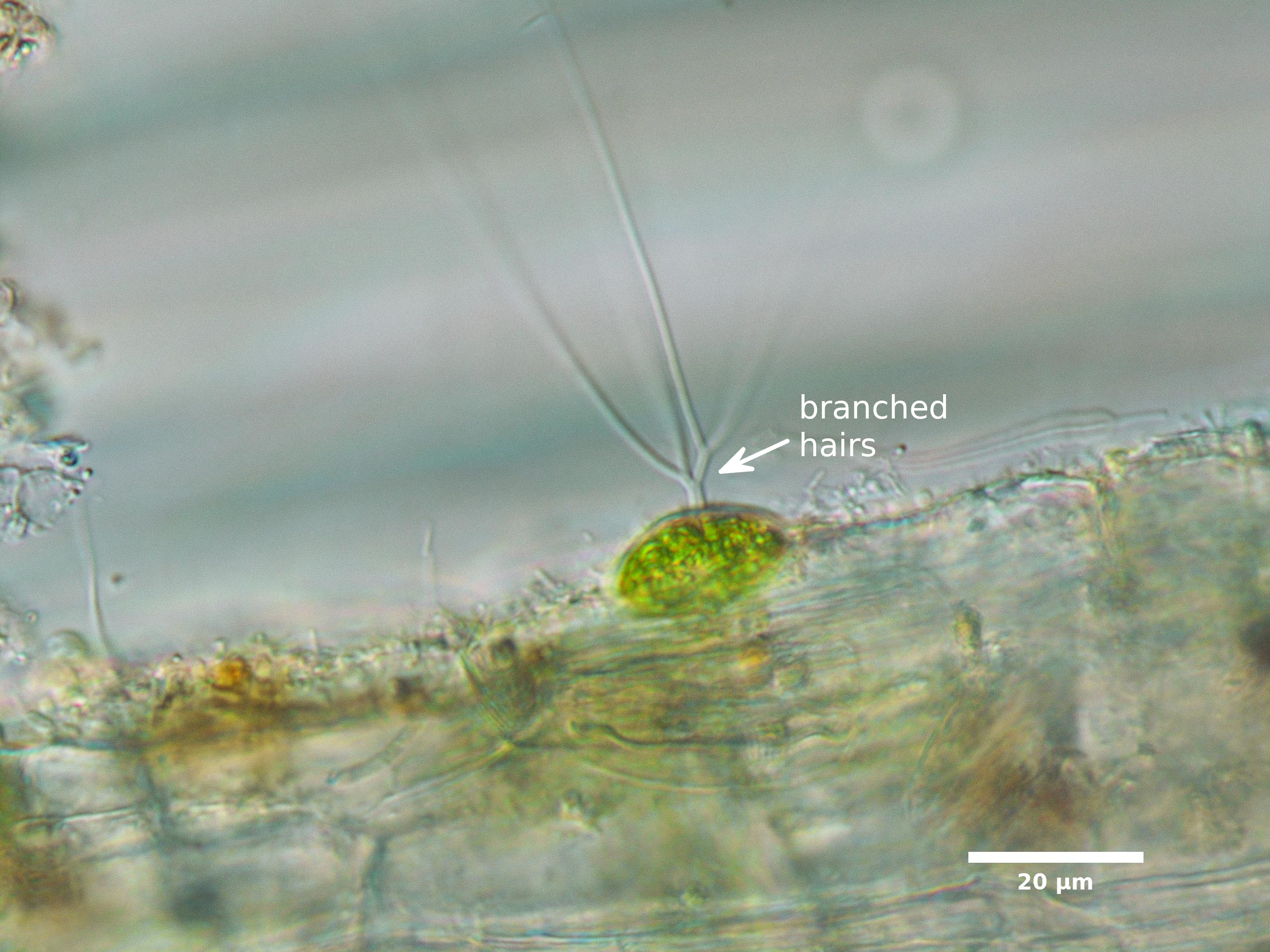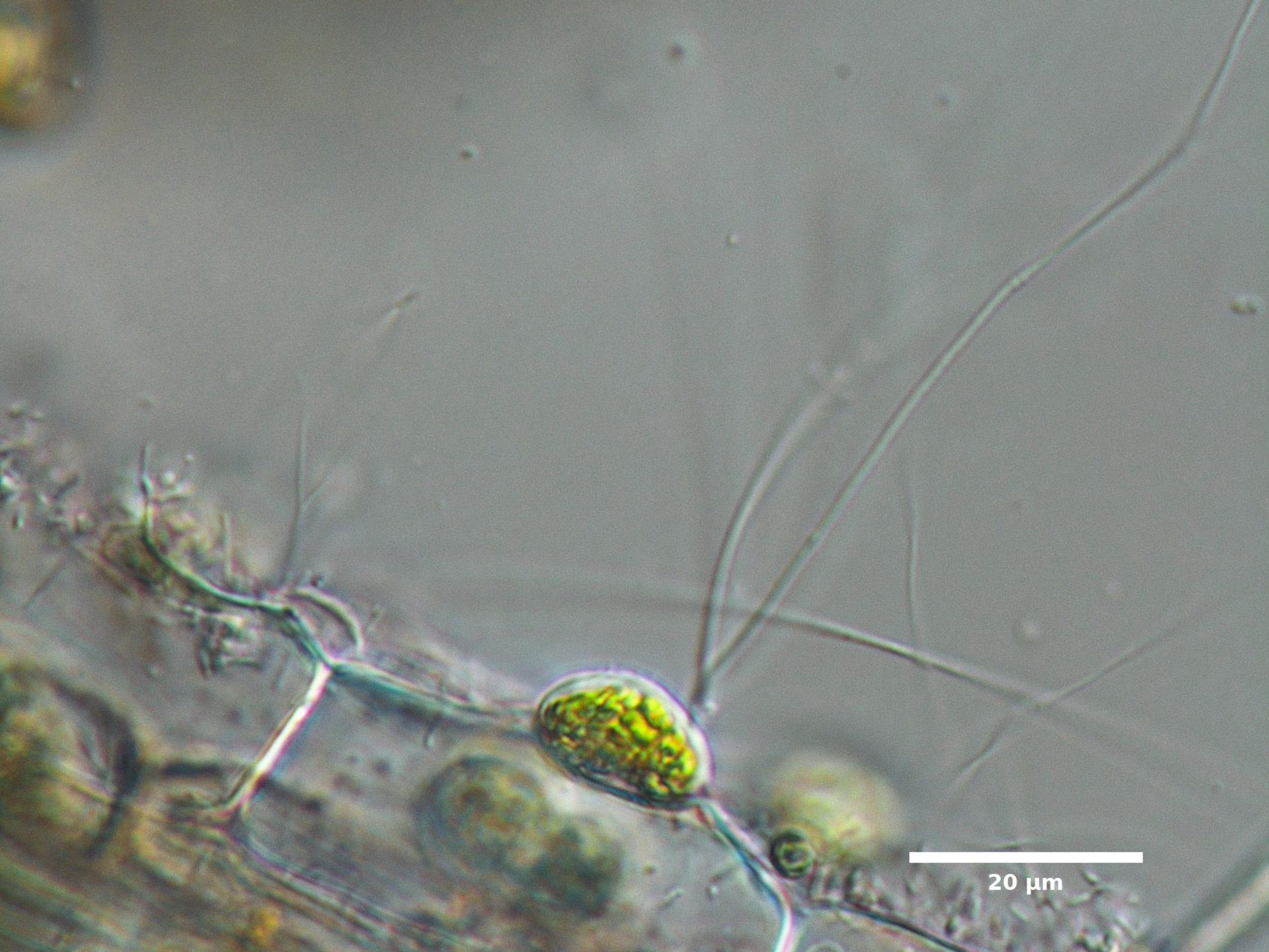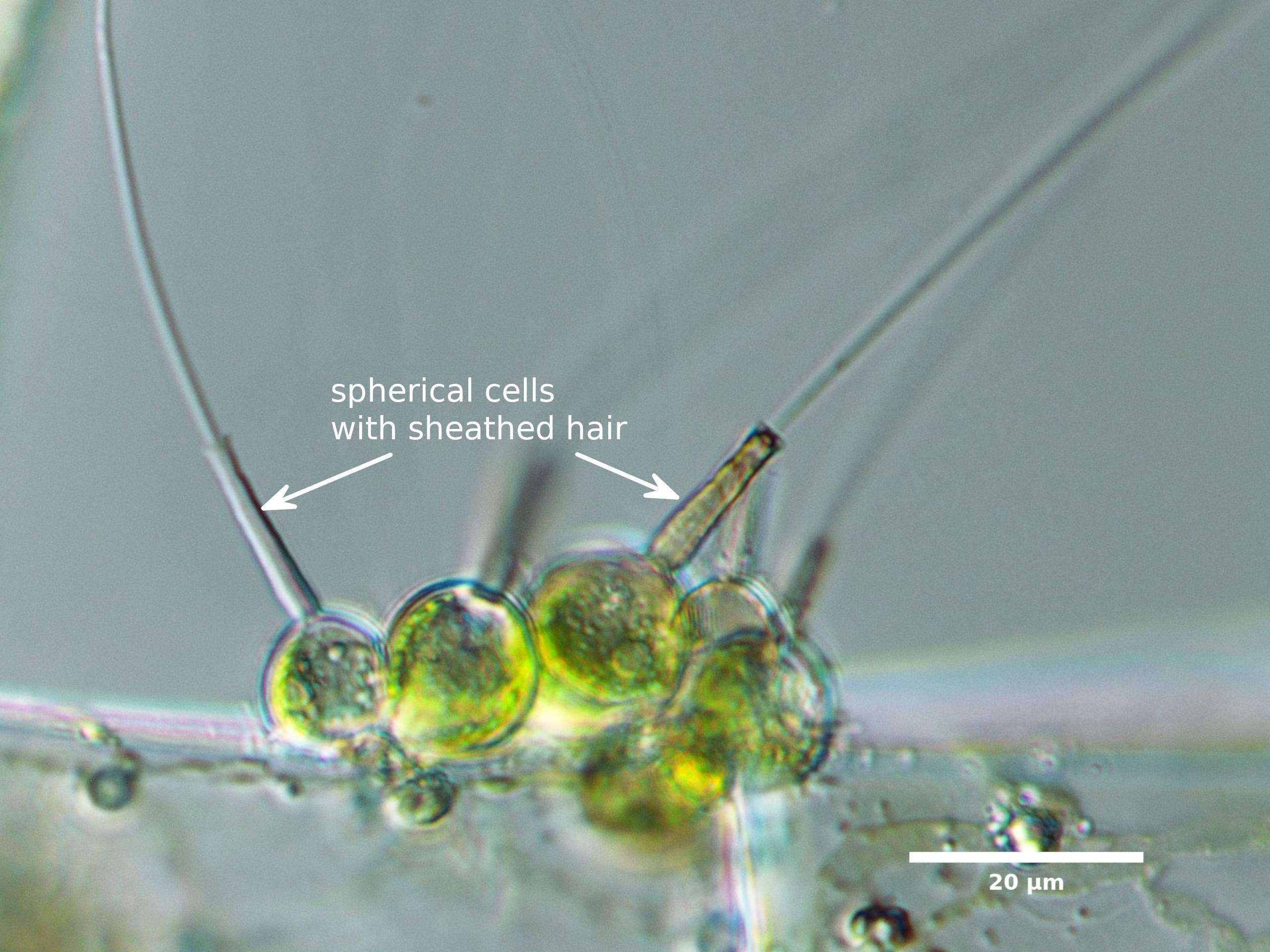 E2. CELLS HEMISPHERICAL (FLATTENED AGAINST SUBSTRATE), WITH LONG, BRANCHED HAIRS; SOLITARY OR IN IRREGULAR COLONIES OR FILAMENTS: