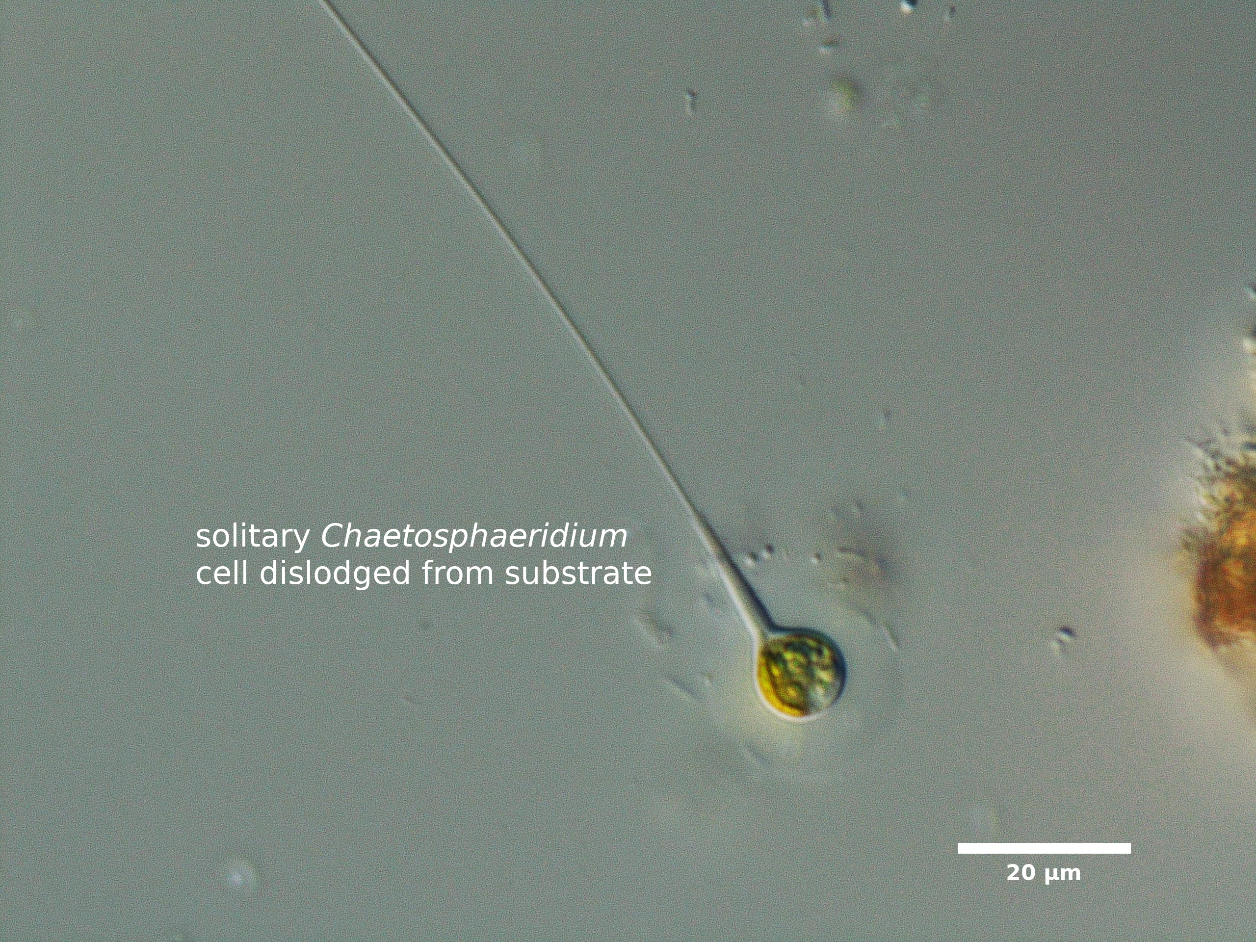 E1. CELLS SPHERICAL WITH SINGLE LONG, SHEATHED HAIR; SOLITARY OR IN IRREGULAR COLONIES OR FILAMENTS: