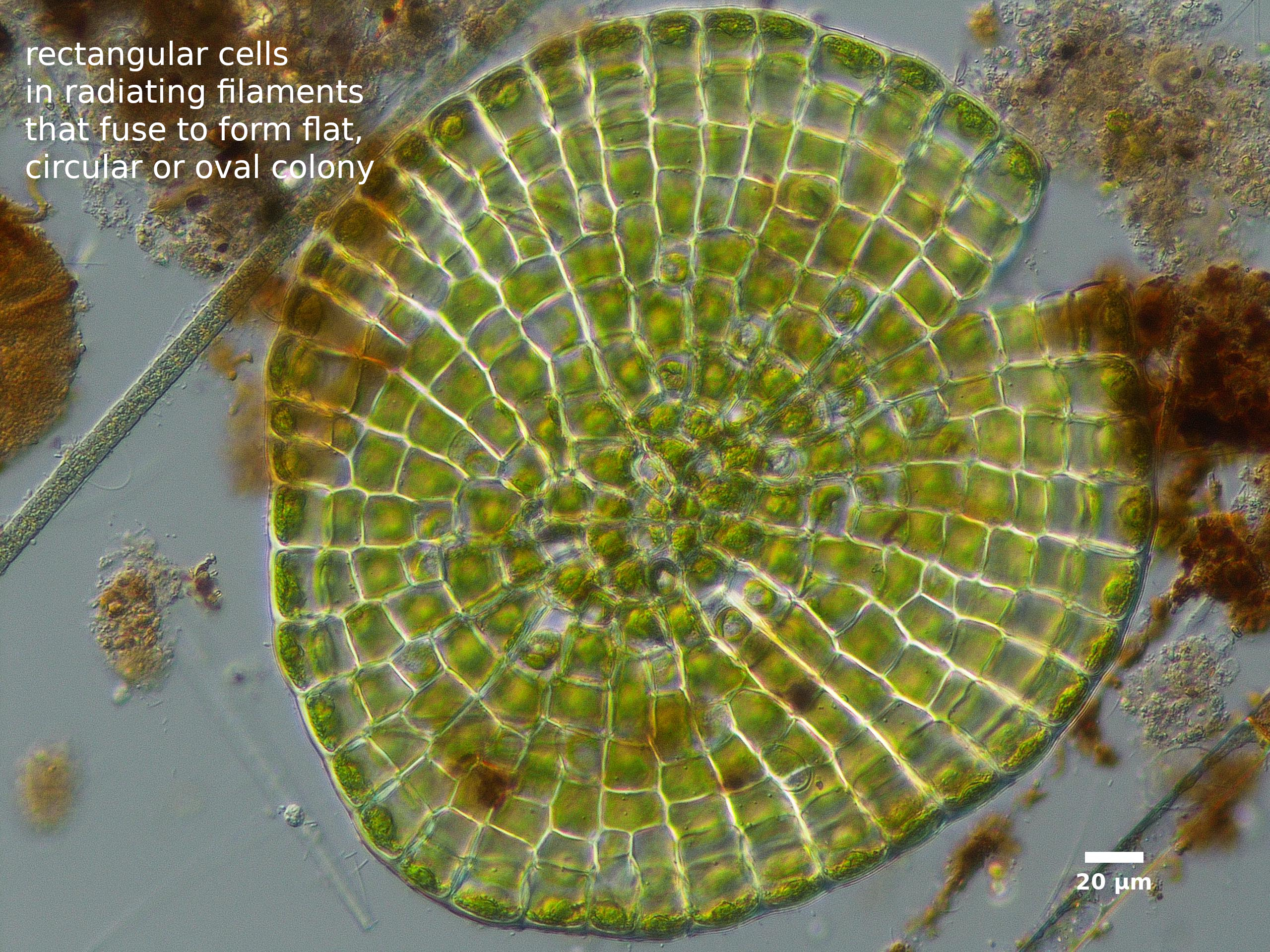 E3. CELLS RECTANGULAR, BRIGHT GREEN; JOINED INTO LONG FILAMENTS RADIATING FROM CENTRAL POINT TO FORM FLAT, SPHERICAL OR OVAL COLONY:
