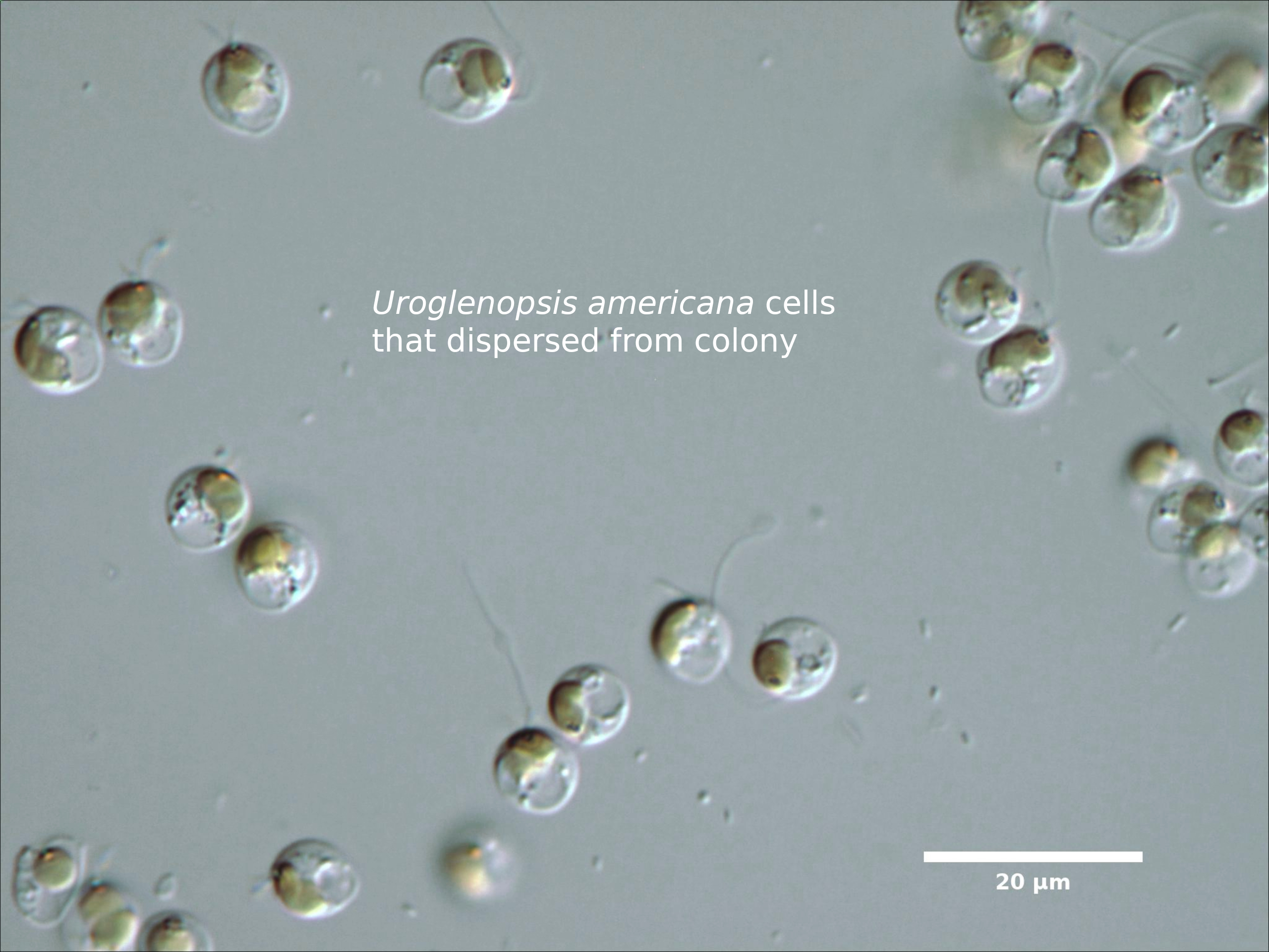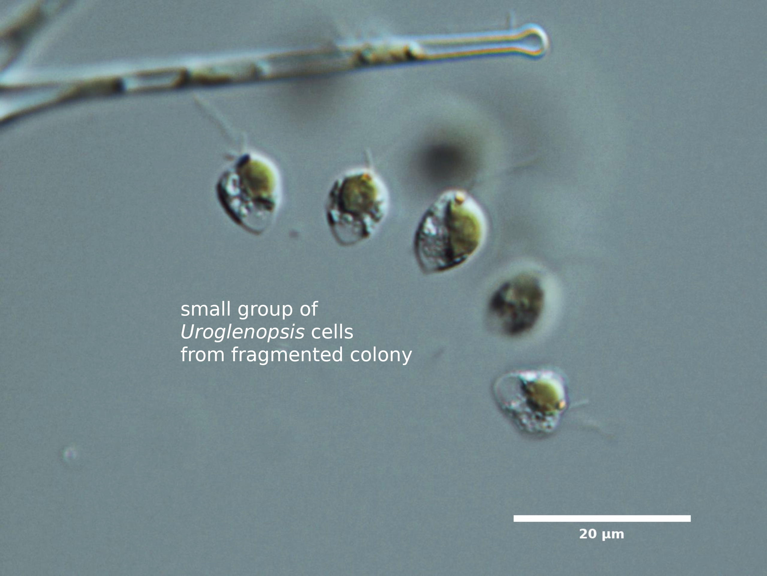 E2. CELLS SMOOTH (NOT SPINY); SOLITARY OR IN COLONIES OF OVAL OR TEARDROP-SHAPED CELLS JOINED BY LONG, FRAGILE MUCILAGE THREADS:
