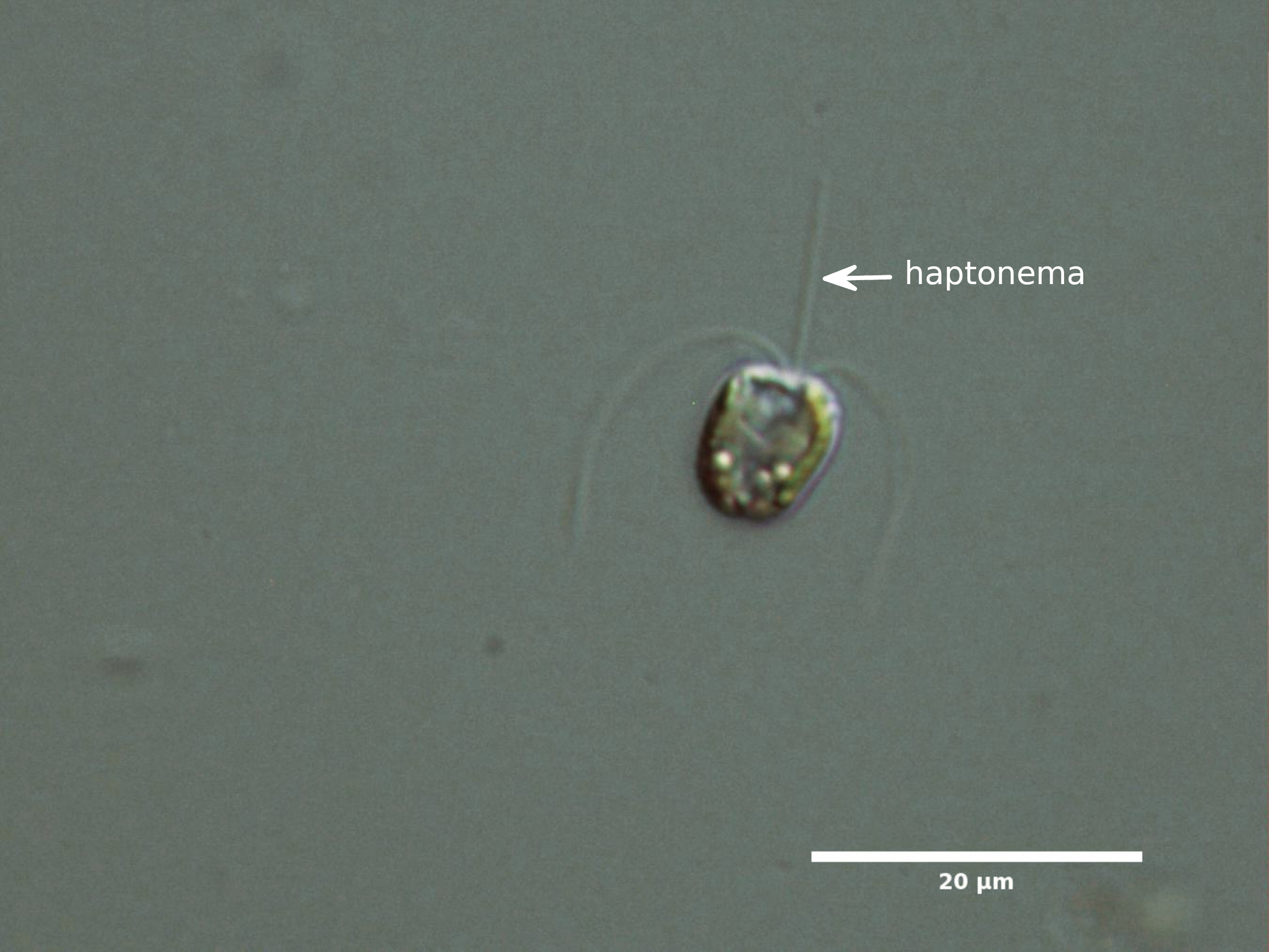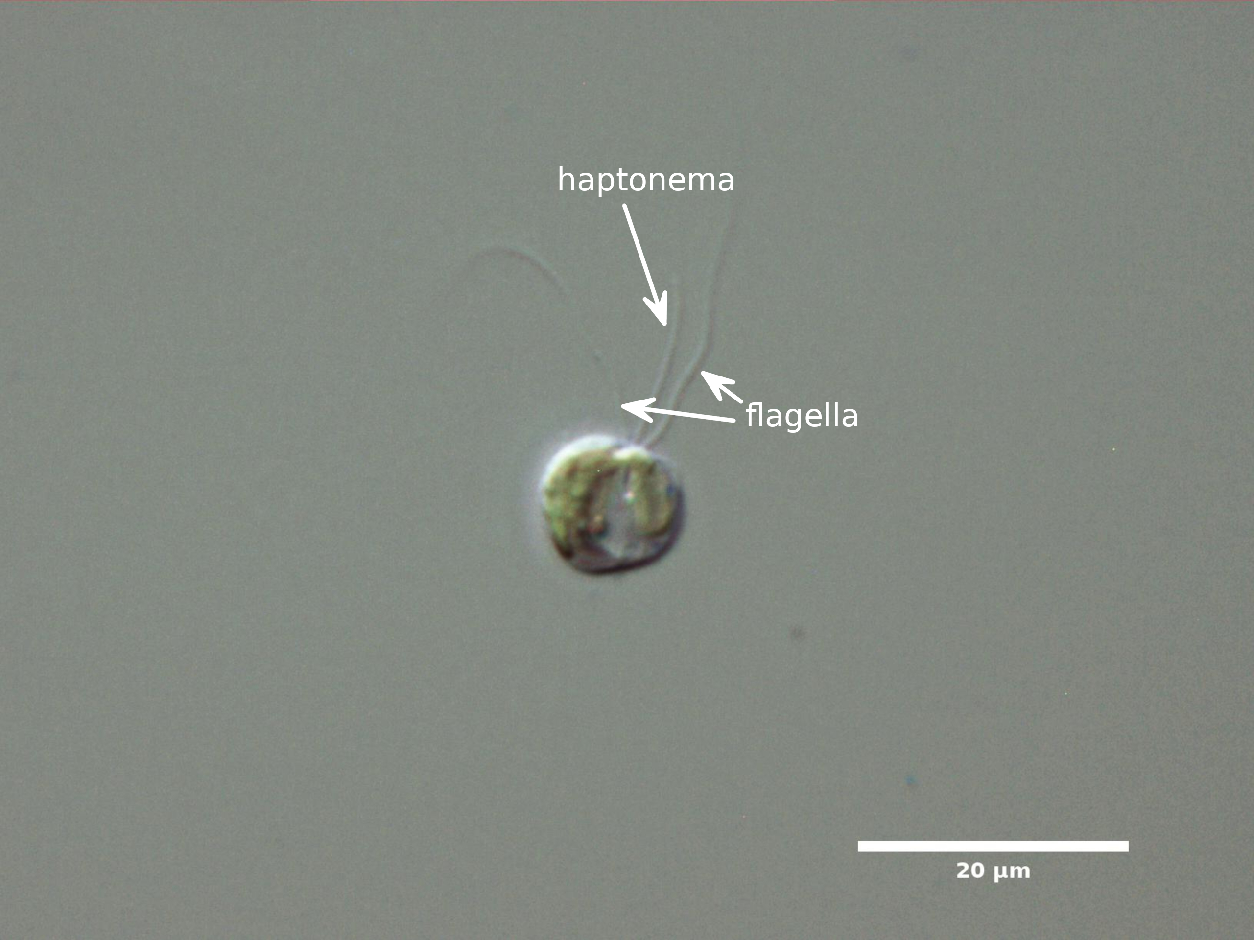 D1. CELLS SPHERICAL OR OVAL WITH WHAT APPEARS TO BE 3 FLAGELLA (2 FLAGELLA AND A HAPTONEMA):