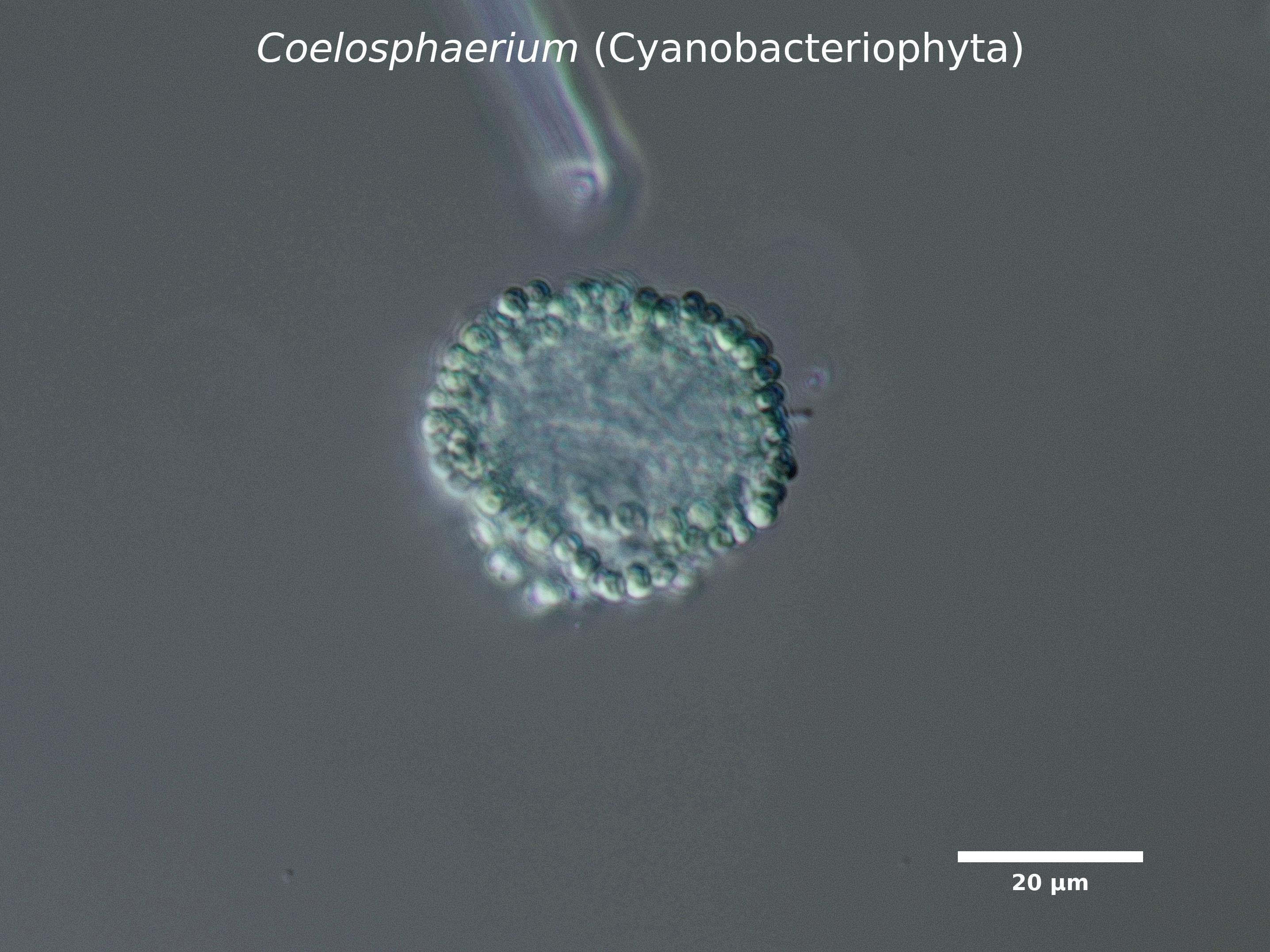 F2. Cells bright bluegreen, often in groups of 2 or 4, arranged on the outer perimeter of a hollow colony: